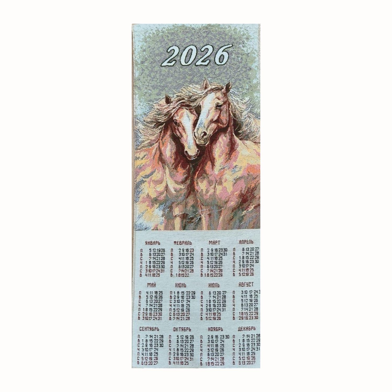 Календарь на 2026 год с символом наступающего года. Изображение выполнено путем сложного жаккардового переплетения цветных нитей. Гобеленовые узоры – самые прочные и стойкие к истиранию и выцветанию. Применение полиэфирного волокна позволяет использовать широкую палитру цветов. По краям полотна вставлена трубочка для формоустойчивости. Календарь из гобелена станет интересным украшением интерьера и отличным подарком к Новому году.