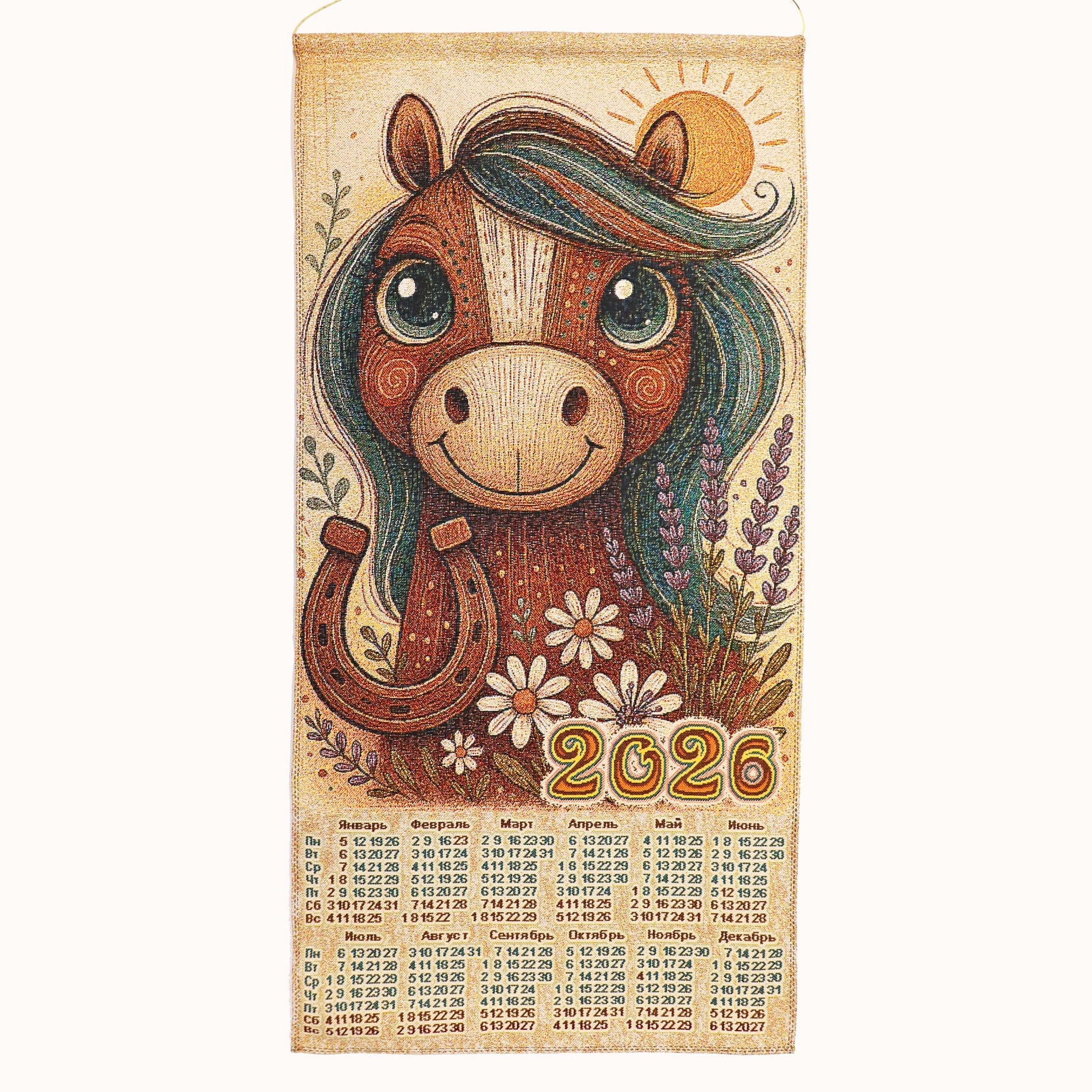 Календарь на 2026 год с символом наступающего года. Изображение выполнено путем сложного жаккардового переплетения цветных нитей. Гобеленовые узоры – самые прочные и стойкие к истиранию и выцветанию. Применение полиэфирного волокна позволяет использовать широкую палитру цветов. По краям полотна вставлена трубочка для формоустойчивости. Календарь из гобелена станет интересным украшением интерьера и отличным подарком к Новому году.