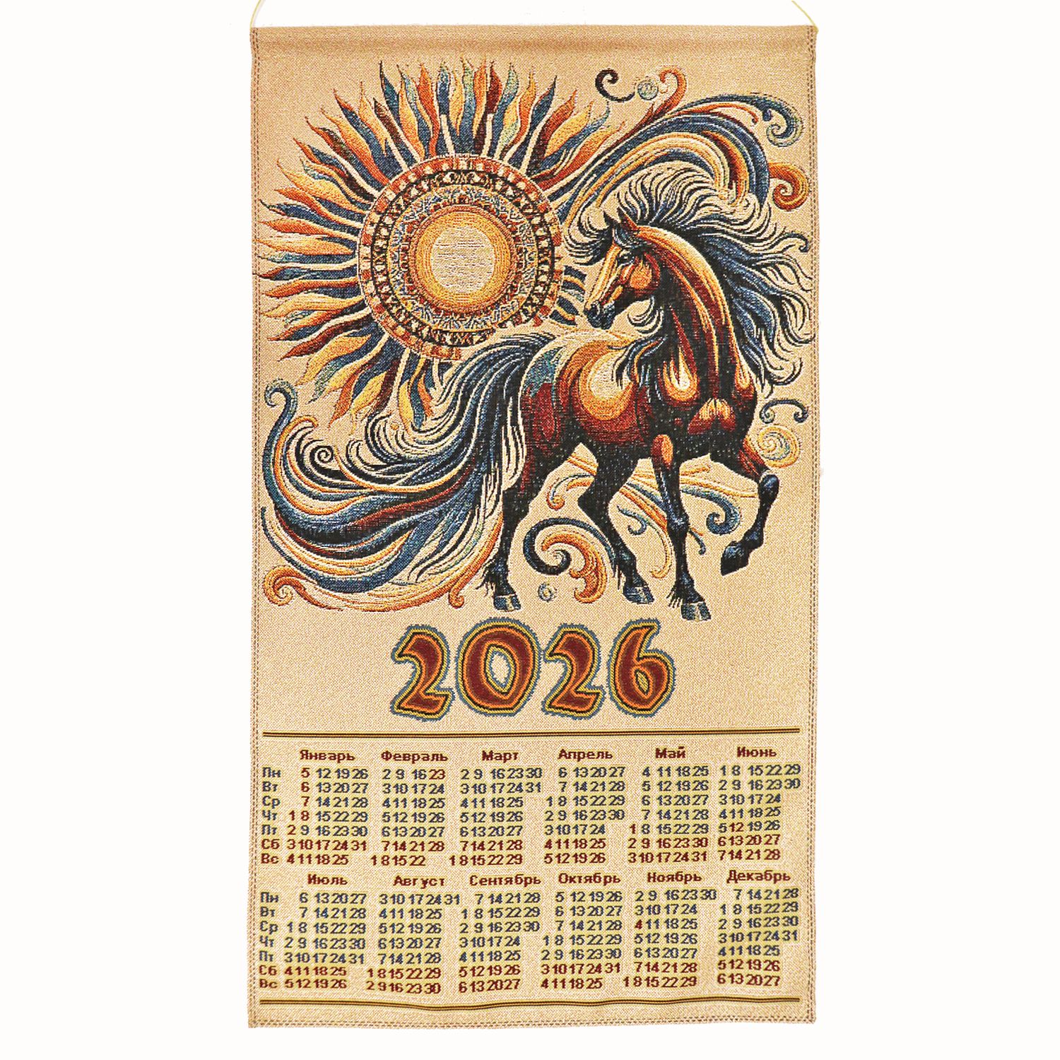 Календарь на 2026 год с символом наступающего года. Изображение выполнено путем сложного жаккардового переплетения цветных нитей. Гобеленовые узоры – самые прочные и стойкие к истиранию и выцветанию. Применение полиэфирного волокна позволяет использовать широкую палитру цветов. По краям полотна вставлена трубочка для формоустойчивости. Календарь из гобелена станет интересным украшением интерьера и отличным подарком к Новому году.