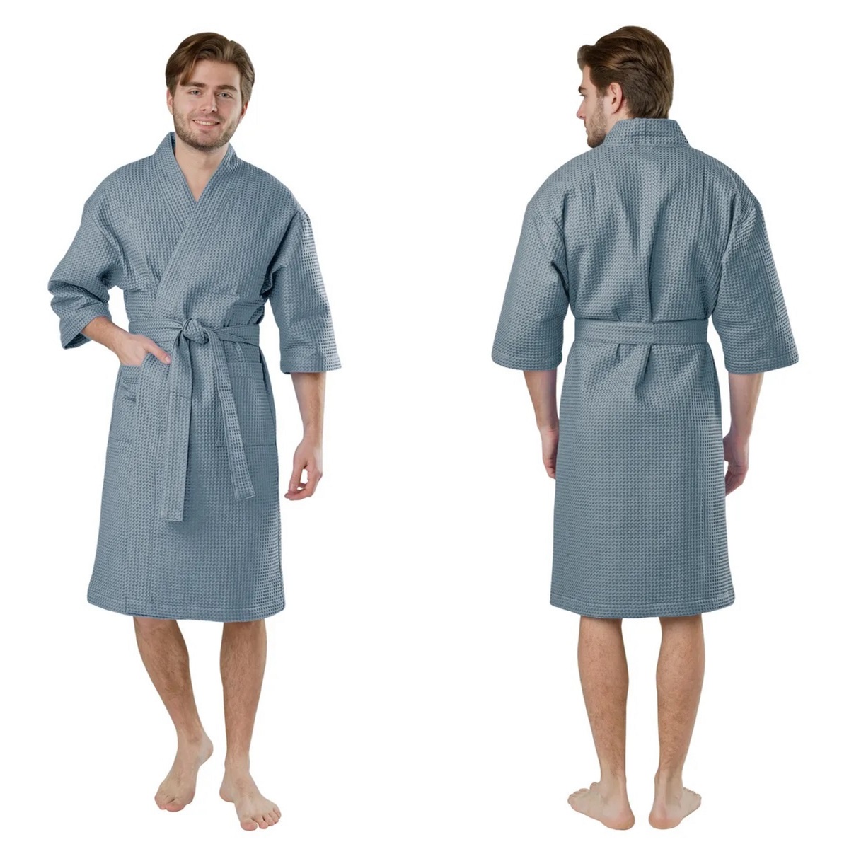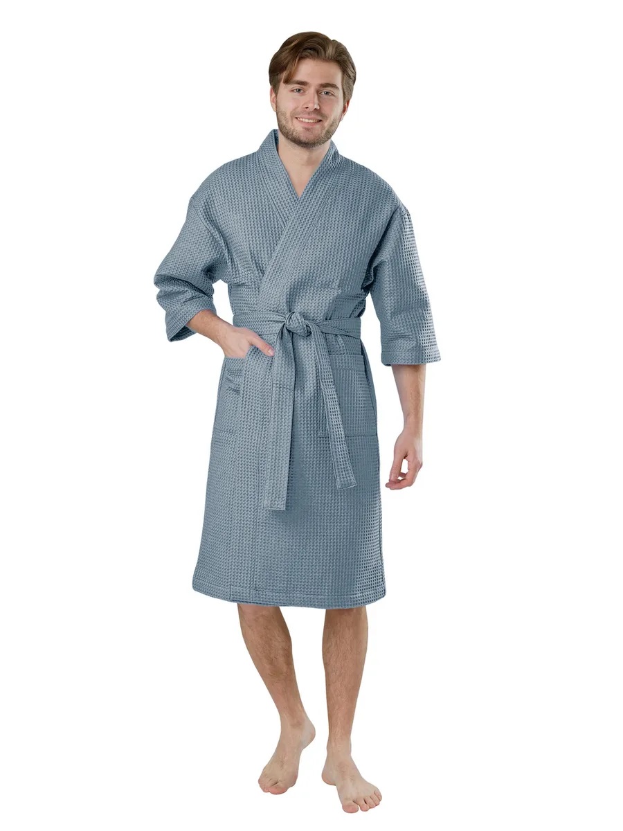 Универсальный вафельный халат станет идеальным выбором как для домашнего использования в любое время года, так и для посещения бани, бассейна, спа-салонов. Натуральная вафельная ткань из хлопка, отлично пропускает воздух, обладает отличной гигроскопичностью и дает коже дышать, поэтому в теплое время года (летом и весной) в этом халате можно чувствовать себя комфортно и уютно. В холодное время года вафельные халаты также будут очень удобны и практичны, поскольку они достаточно плотные и хорошо удерживают тепло. Очень легкие халаты, не сковывают движений и вызывают ощущение комфорта и свободы. Воротник кимоно, карманы и манжеты рукава отделаны однотонным кантом, что придает данным халатам некую строгость и выдержанность в классическом стиле. Такие халаты прекрасно впитывают влагу, быстро сохнут, а рельефный рисунок в структуре ткани обеспечивает массажный эффект и принесет эстетическое удовольствие.