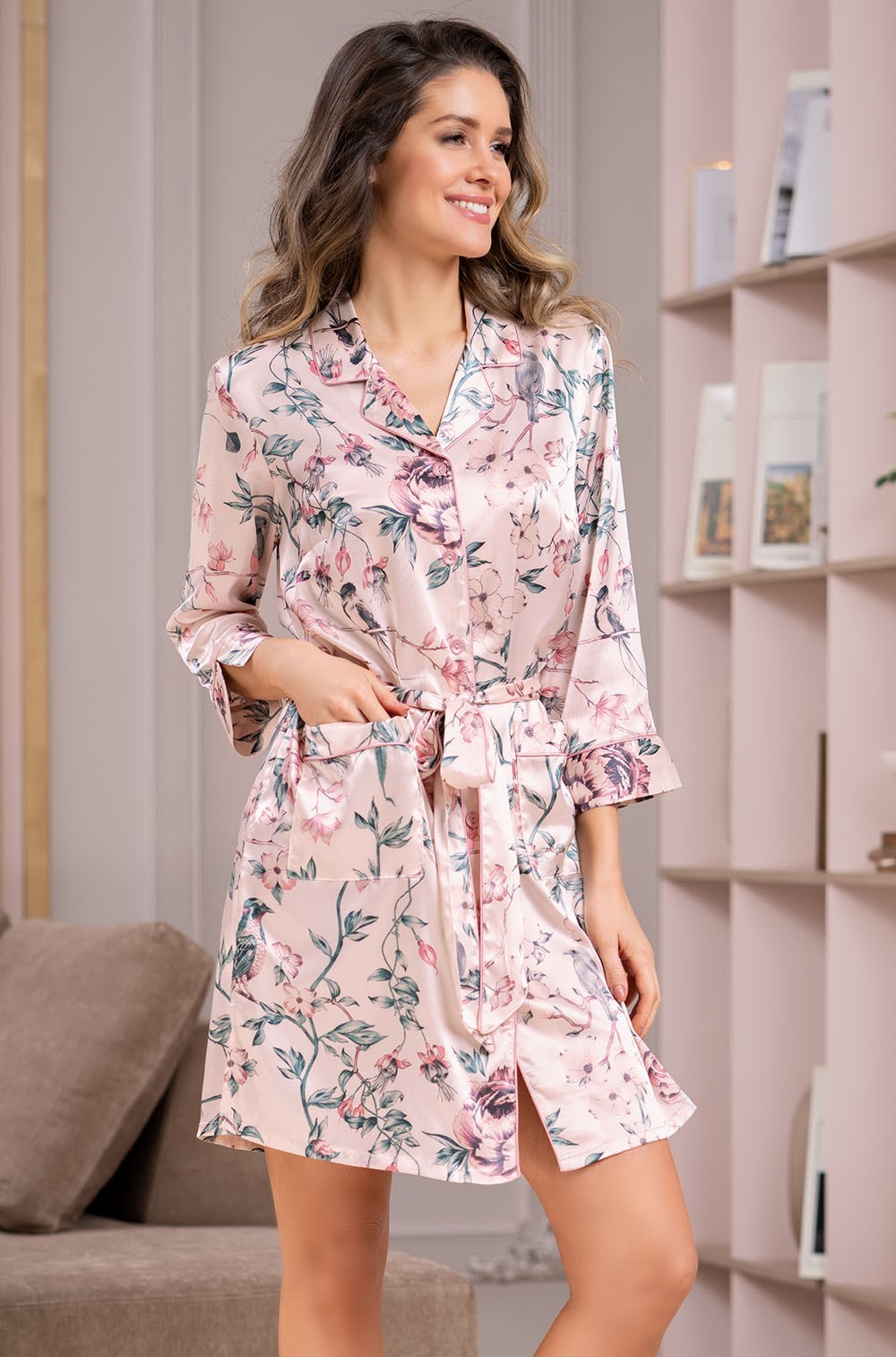 Короткий халат-рубашка Mia-Amore с широким длинным рукавом, выполнен из принтованного искусственного шелка с блеском. Модель декорирована кантом в тон изделия. По бокам расположены накладные карманы. Халат из искусственного шелка на основе синтетических волокон легкий и приятный на ощупь, практически не чувствуется на теле. Шелковое полотно блестящее, с интересной текстурой, красиво драпируется и выглядит невесомым. Ткань не деформируется при намокании и сушке, не дает усадки после стирки, не боится прямых солнечных лучей и не выцветает.