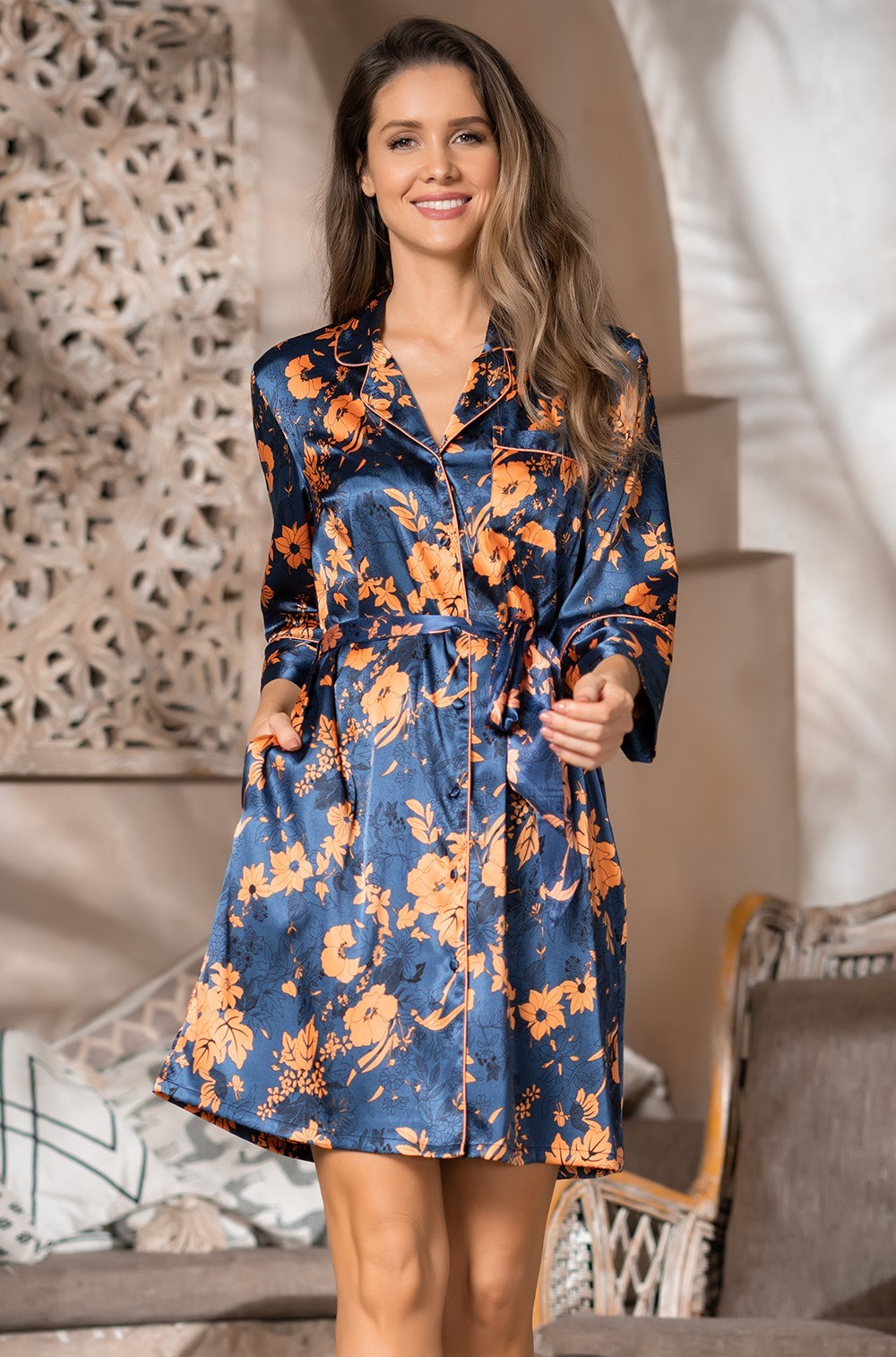 Халат-рубашка Mia-Amore с широкими рукавами 3/4 и контрастным кантом. Борта халата обработаны обтачкой. В боковых швах расположены карманы. Модель дополнена поясом чтобы подчеркнуть линию талии. Халат из натурального шелка подарит приятные тактильные ощущения и комфорт в носке: прохладная на ощупь, легкая и невесомая ткань практически не чувствуется на теле. Шелк не вызывает аллергической реакции и раздражения на нежной, чувствительной коже, а также благотворно воздействует на нее благодаря особым протеинам, входящим в состав волокон. Шелковое полотно отлично пропускает воздух, позволяя коже дышать и хорошо впитывает влагу.