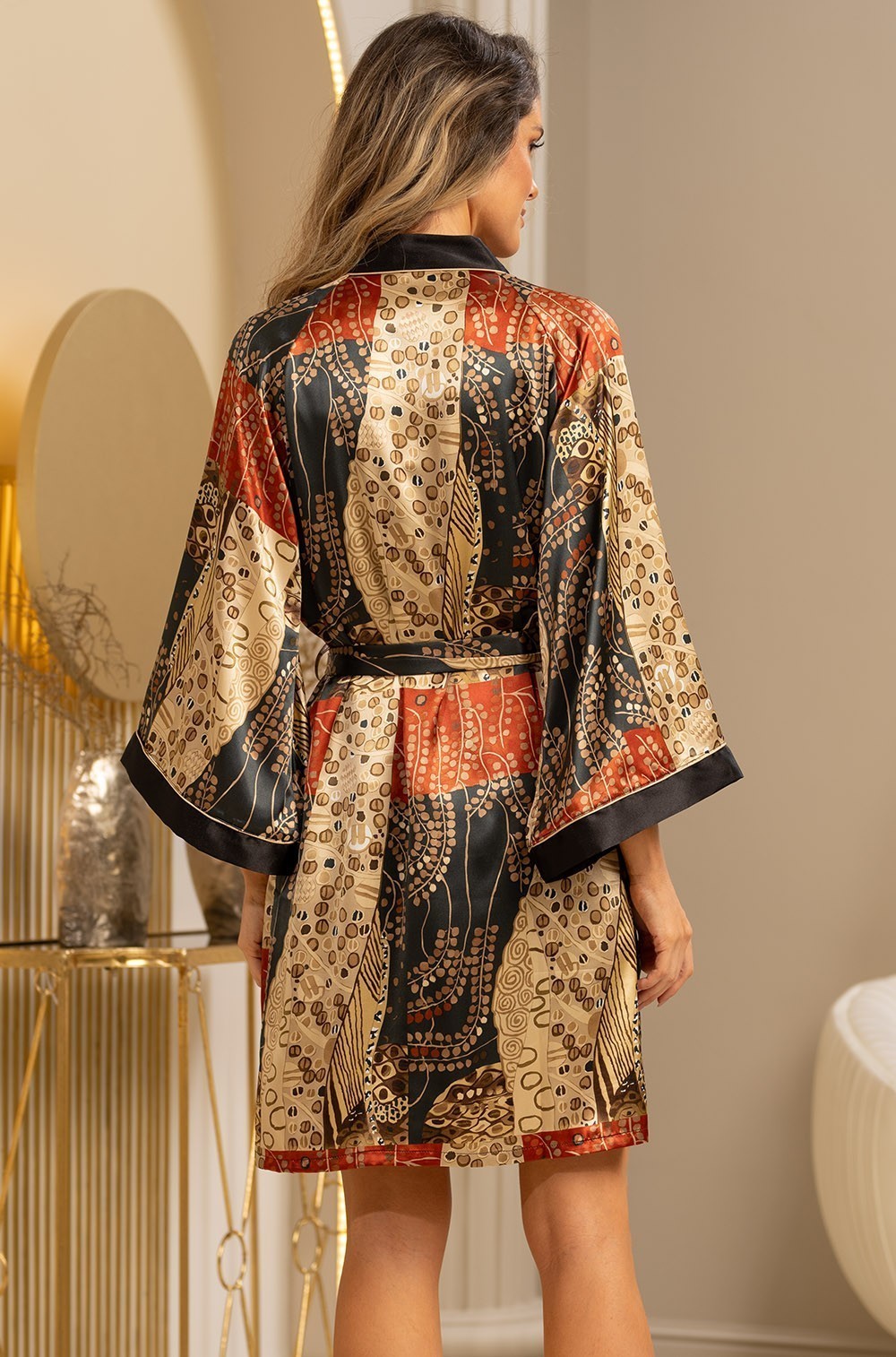 Короткий запашной халат Mia-Amore с широкими рукавами 3/4 и контрастным кантом. Борта халата и низ рукавов обработаны однотонной отделкой. В боковых швах расположены карманы. Модель дополнена поясом чтобы подчеркнуть линию талии. Халат из натурального шелка подарит приятные тактильные ощущения и комфорт в носке: прохладная на ощупь, легкая и невесомая ткань практически не чувствуется на теле. Шелк не вызывает аллергической реакции и раздражения на нежной, чувствительной коже, а также благотворно воздействует на нее благодаря особым протеинам, входящим в состав волокон. Шелковое полотно отлично пропускает воздух, позволяя коже дышать и хорошо впитывает влагу.