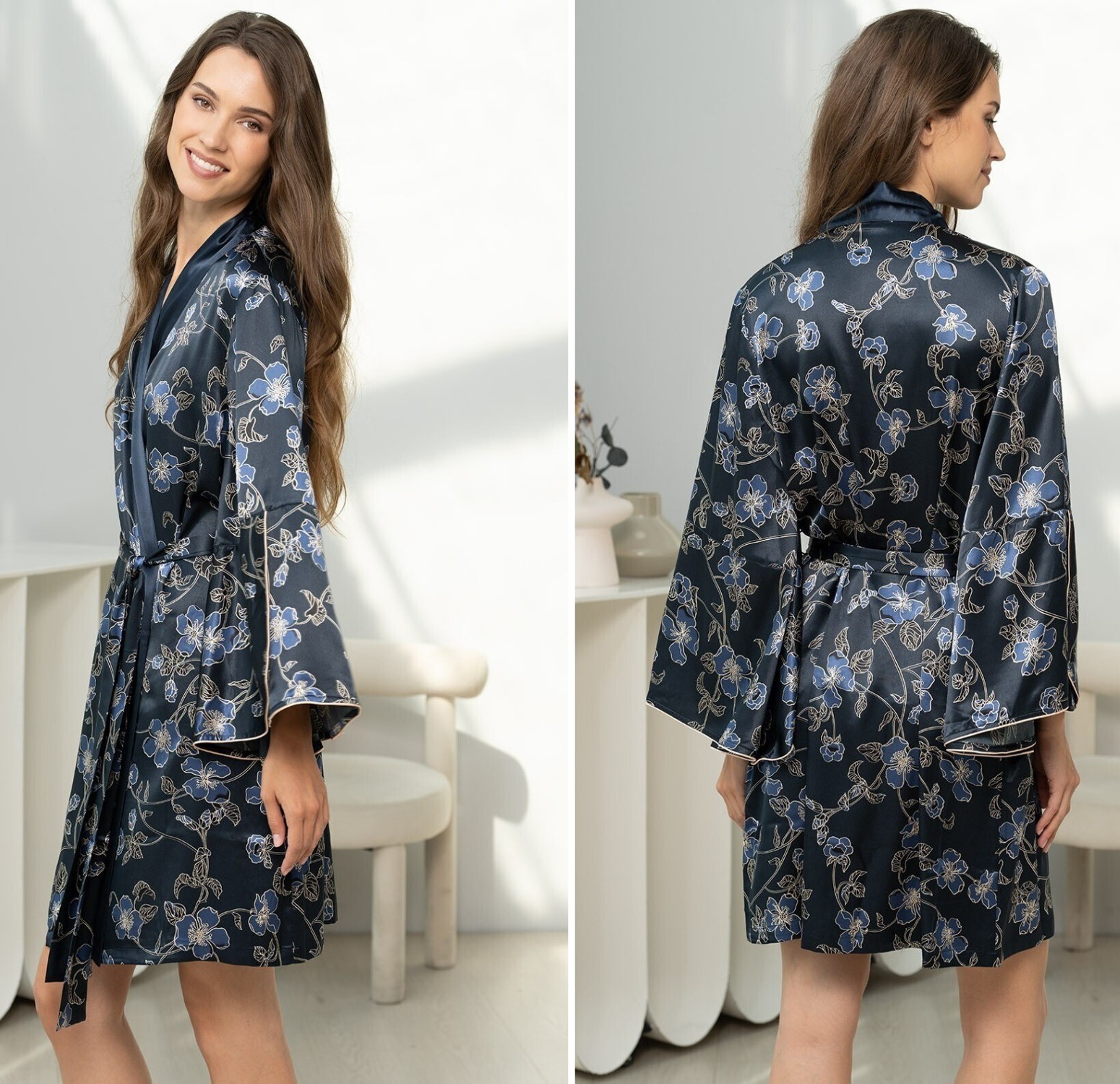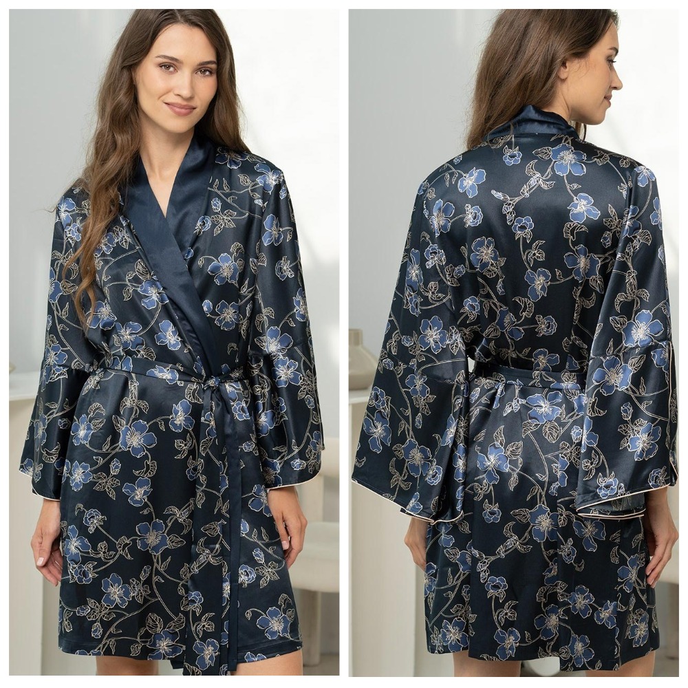 Женский халат-кимоно от бренда Mia-Amore - это домашний комфорт и женственность. Выполненный в темно-синей гамме из мягкого смесового натурального шёлка с цветочным принтом, он подчёркивает талию и добавляет очарования домашней обстановке. Планка выполнена с широкой однотонной отделкой. Халат декорирован однотонным кантом. Халат из натурального шелка подарит приятные тактильные ощущения и комфорт в носке: прохладная на ощупь, легкая и невесомая ткань практически не чувствуется на теле. Шелк не вызывает аллергической реакции и раздражения на нежной, чувствительной коже, а также благотворно воздействует на нее благодаря особым протеинам, входящим в состав волокон. Шелковое полотно отлично пропускает воздух, позволяя коже дышать и хорошо впитывает влагу.