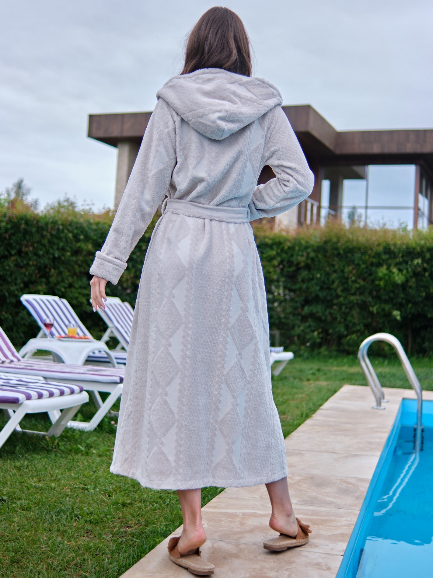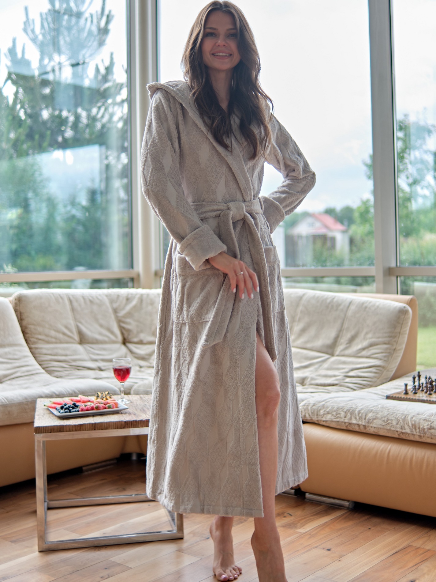 Элегантный женский халат бренда Vien классического фасона с капюшоном, на запахе со съемным поясом. Манжет рукава легко подвернуть по длине. По бокам два глубоких, накладных кармана. Утончённые линии приталенного кроя чуть расклешенного книзу, в сочетании с жаккардовым рисунком, элегантнo подчеркнут силуэт. Внешняя сторона ткани - бархатистый велюр, внутренняя - мягкая махра. Благодаря особому переплетению бамбуковых волокон материал обладает «дышащими» свойствами и сохраняет приятную для кожи прохладу. Обладает высокой гигроскопичностью и особенными природными свойствами – антибактериальными, дезодорирующими и останавливающими рост бактерий. Данные свойства ткани сохраняются даже после пятидесяти стирок. Изделия из бамбукового волокна обладают стойкостью к условиям машинной стирки.