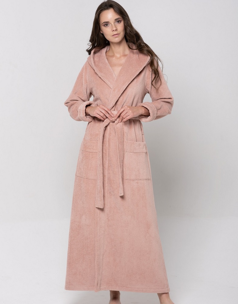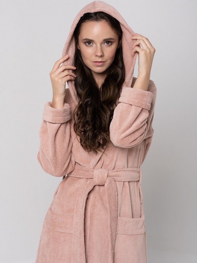 Элегантный женский халат бренда Vien классического фасона с капюшоном, на запахе со съемным поясом. Манжет рукава легко подвернуть по длине. По бокам два глубоких, накладных кармана. Изделие хорошо сидит, имеет увеличенную длину (140 см). Внешняя сторона ткани - бархатистый велюр, внутренняя - мягкая махра. Благодаря особому переплетению бамбуковых волокон материал обладает «дышащими» свойствами и сохраняет приятную для кожи прохладу. Обладает высокой гигроскопичностью и особенными природными свойствами – антибактериальными, дезодорирующими и останавливающими рост бактерий. Данные свойства ткани сохраняются даже после пятидесяти стирок. Изделия из бамбукового волокна обладают стойкостью к условиям машинной стирки.