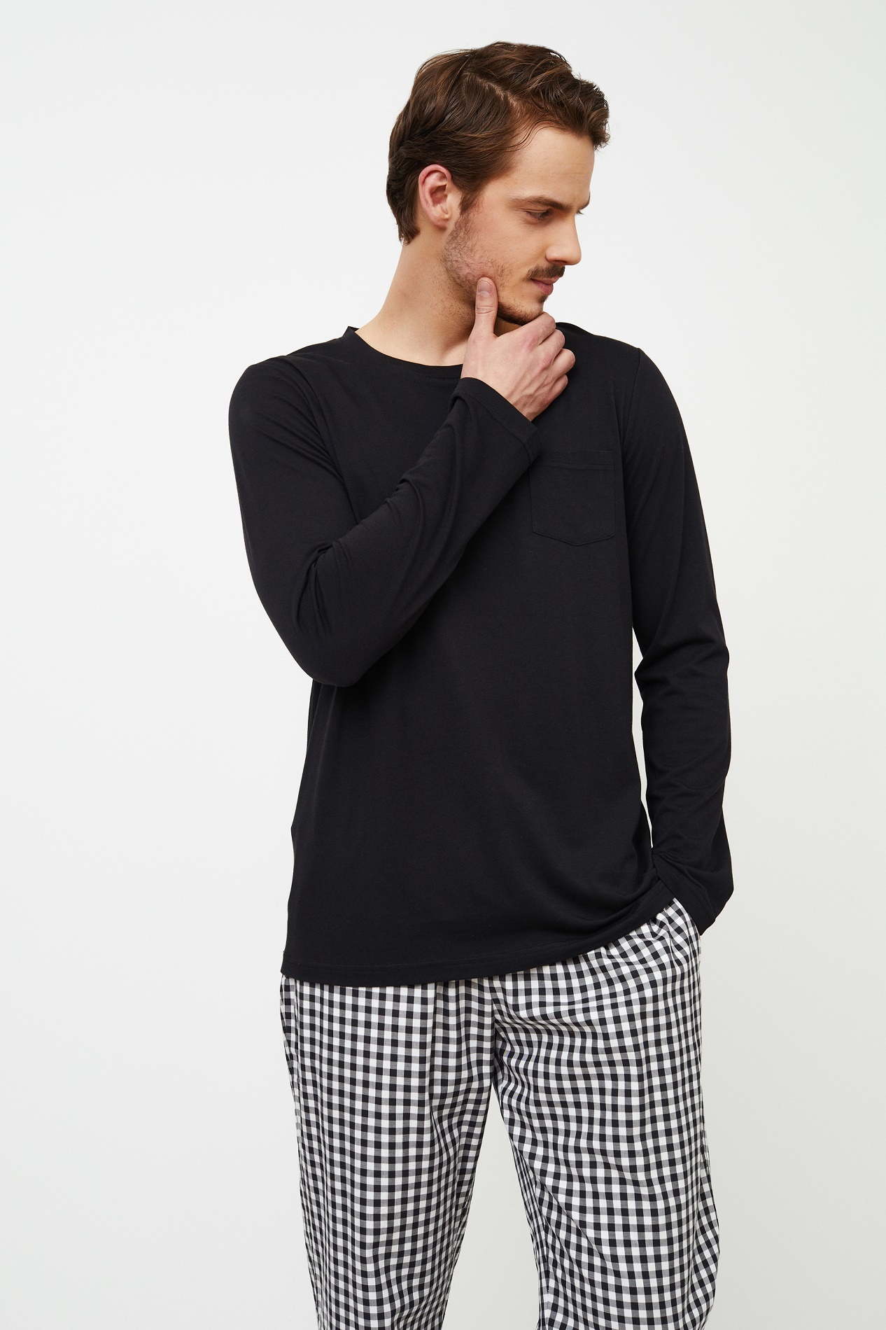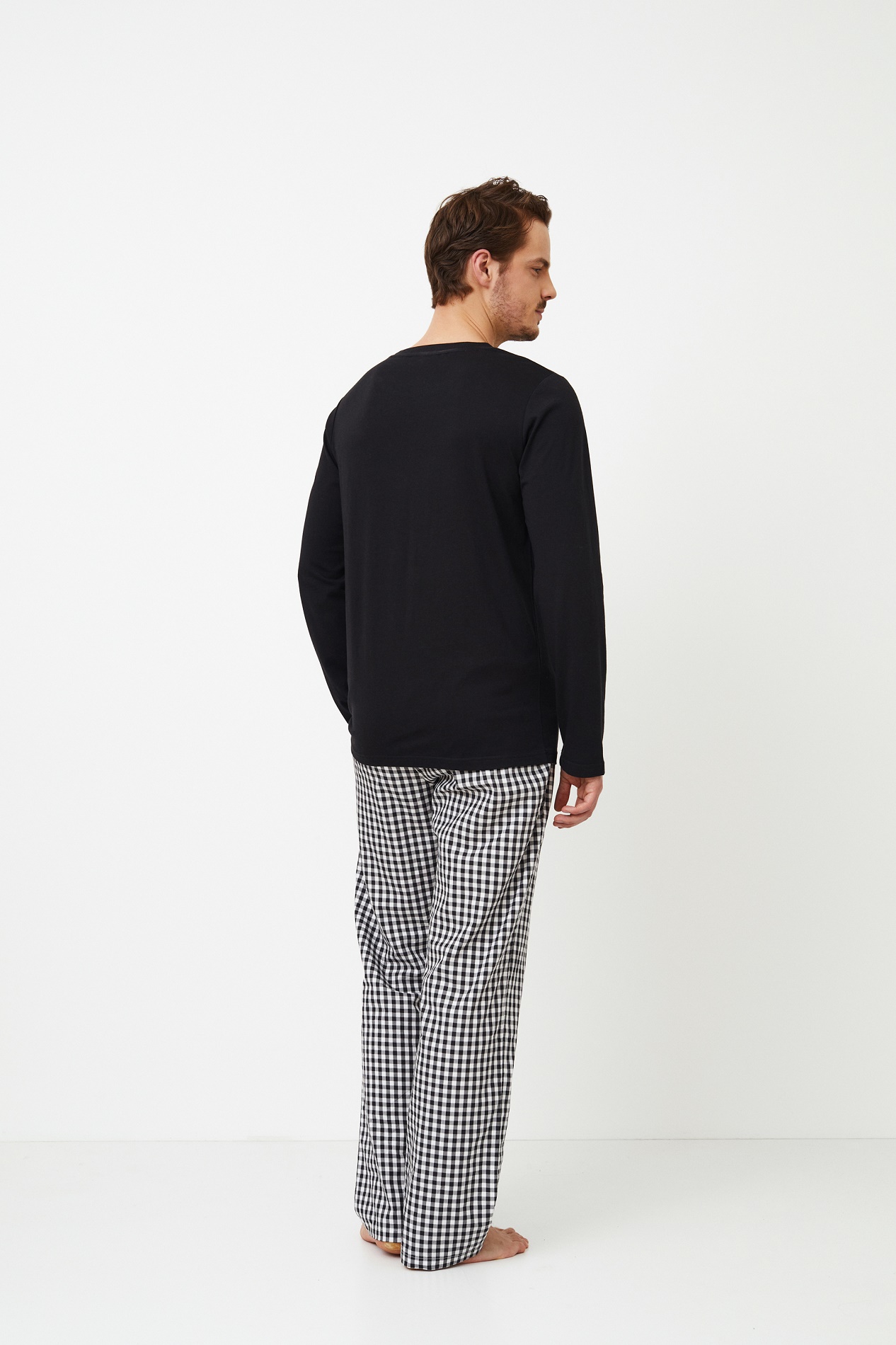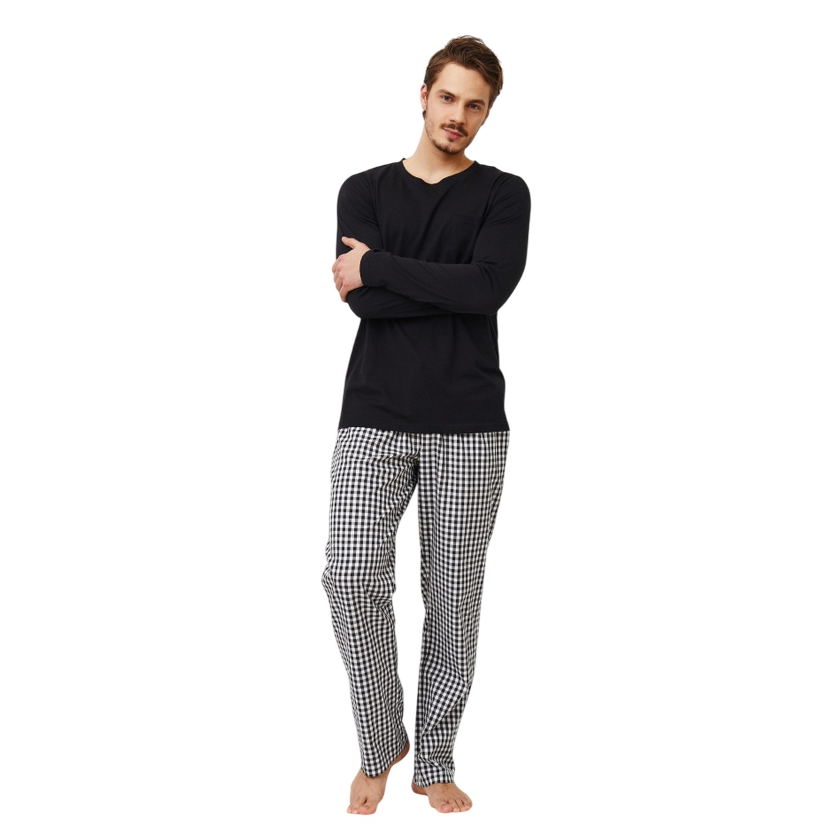 Aruelle – стильный, молодежный литовский бренд. Одежда для людей, которые предпочитают комфорт, наслаждаясь теплотой и домашним уютом. При производстве своей продукции компания всегда руководствуется последними тенденциями моды и использует только лучшие ткани. Бренд Aruelle для тех кто ценит качество и стиль. Пижама Philip станет идеальным выбором для комфорта вне времени. Однотонный черный топ с круглым вырезом из смеси хлопка и модала легко сочетается с классическими брюками в черно-белую клетку из хлопка с удобными карманами. У пижамной рубашки есть необычный карман с левой стороны. Состав: верх: 50% хлопок, 50% модал, низ: 100% хлопок.