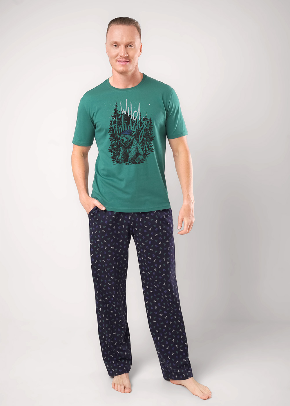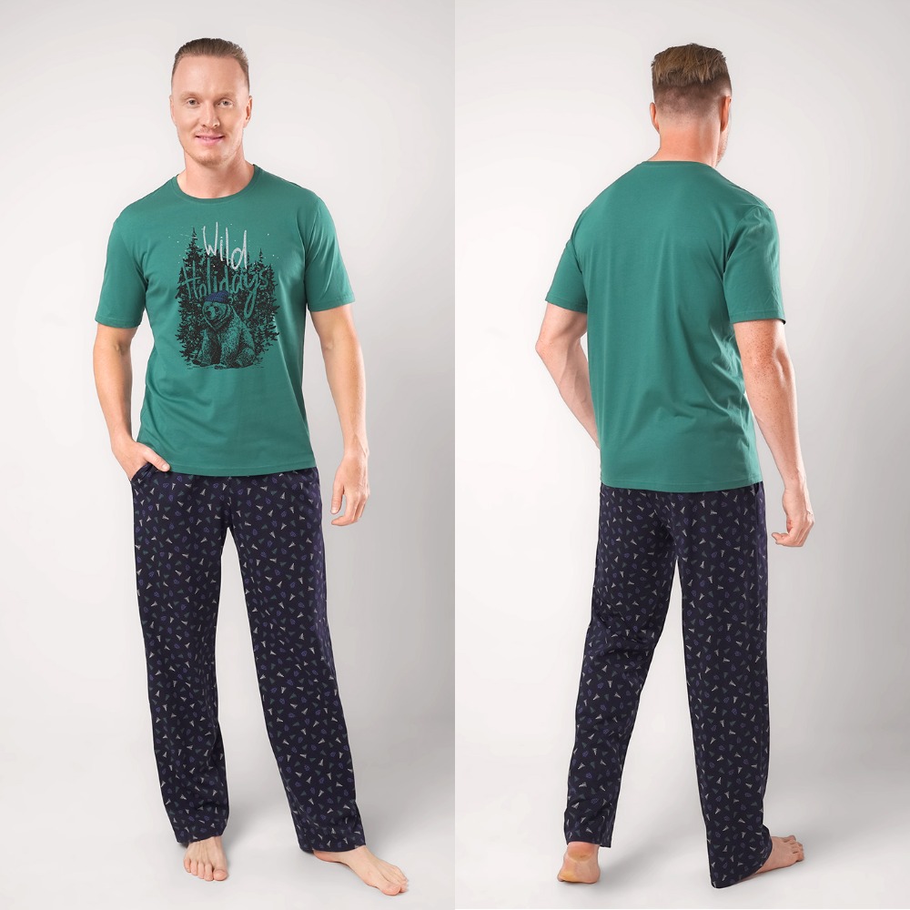 Мужская пижама «Clever» — это стильный и комфортный комплект для дома. Темно-зеленая футболка с коротким рукавом украшена ярким принтом с изображением медведя и надписью «Wild Holidays», что добавляет образу оригинальности. Брюки выполнены из мягкого материала с мелким узором, обеспечивающим уют и удобство. Этот комплект идеально подходит для отдыха и сна, сочетая практичность и модный дизайн.