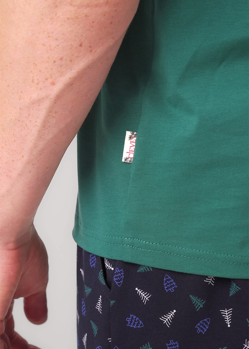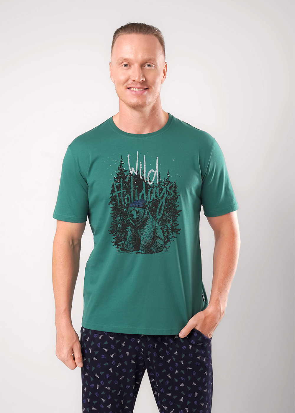 Мужская пижама «Clever» — это стильный и комфортный комплект для дома. Темно-зеленая футболка с коротким рукавом украшена ярким принтом с изображением медведя и надписью «Wild Holidays», что добавляет образу оригинальности. Брюки выполнены из мягкого материала с мелким узором, обеспечивающим уют и удобство. Этот комплект идеально подходит для отдыха и сна, сочетая практичность и модный дизайн.