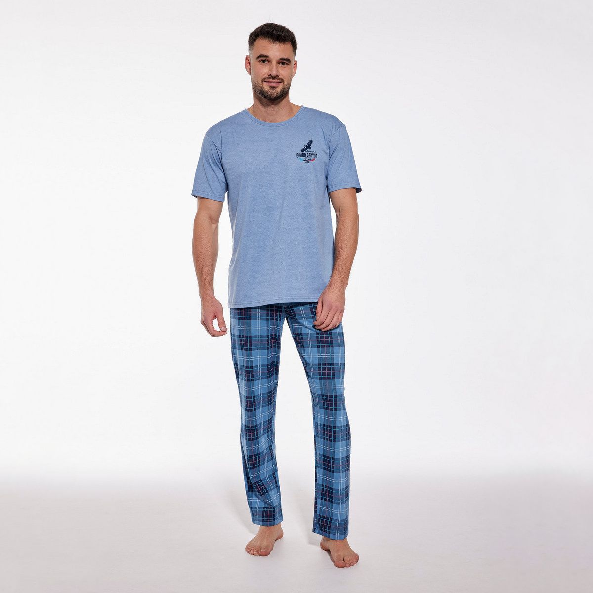 Мягкая и комфортная пижама от европейского производителя Cornette. Изготовлена из высококачественного мягкого хлопка. В комплект входят длинные брюки в клетку и футболка класического кроя.