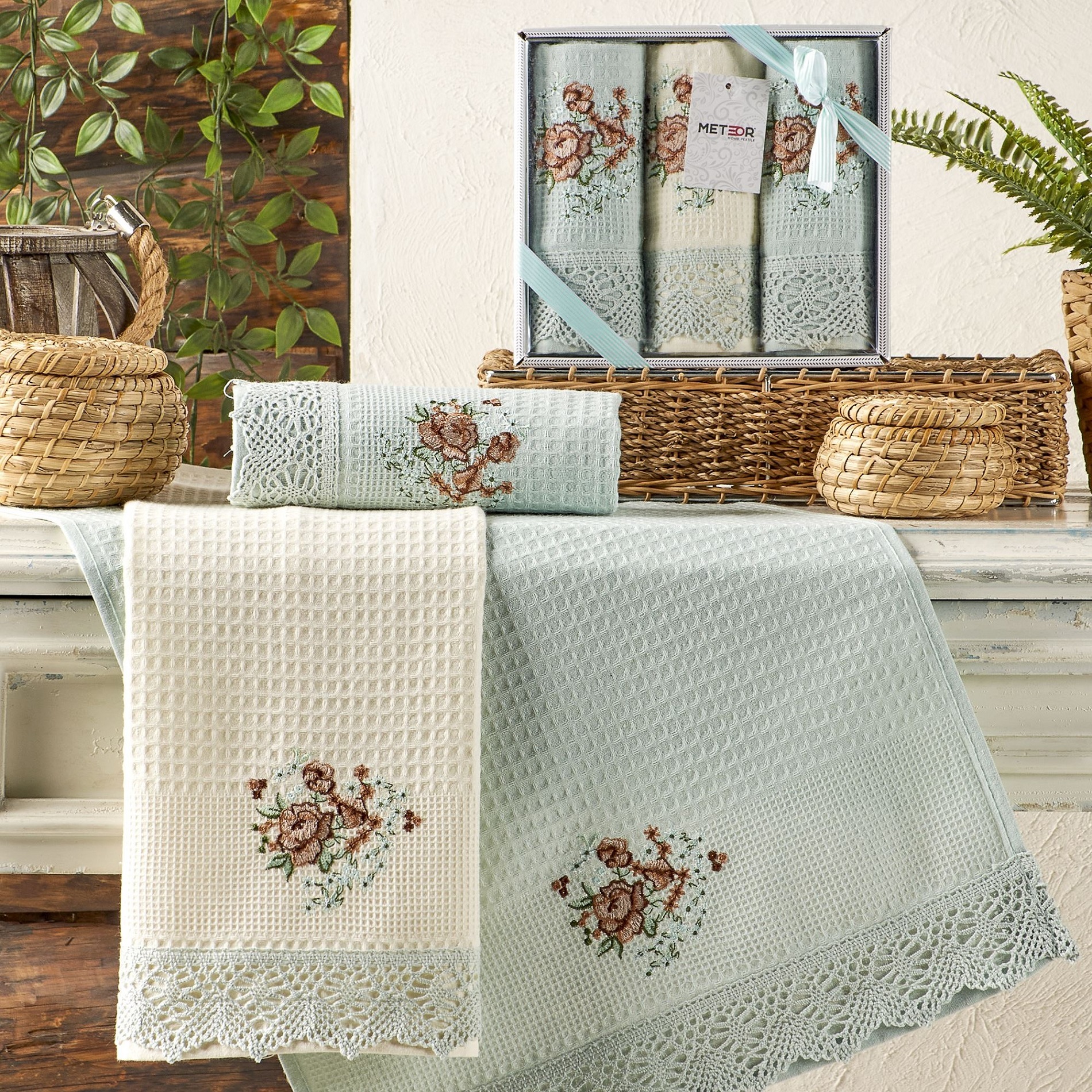 Комплект полотенец турецкого производителя Метеор (Meteor) изготовленные из 100% хлопка, созданы для бережного ухода за посудой и функционального использования в быту. Полотенца изготовлены из вафельного полотна, обладают хорошими впитывающими свойствами. Структура ткани позволяет воздуху свободно проникать через волокна, что позволяет полотенцу быстрее высыхать. Благодаря натуральному составу полотенца обладают отличной износостойкостью, прочностью и будут служить Вам долгое время. Отличаются мягкостью и гипоаллергенностью. Простой процесс ухода. После стирки не линяют и не выцветают, имеют устойчивое окрашивание. В комплект входит 3 полотенеца размером 40*60 см. Гармоничные, натуральные оттенки создадут на вашей кухне уютную атмосферу, а процесс приготовления пищи более комфортным. Полотенца имеют отделку в виде вышивки, подходят для декорирования стола. Подарочные кухонные полотенца – это всегда желанный подарок для любой хозяйки. Как презент на любой праздник или для повседневного использования.