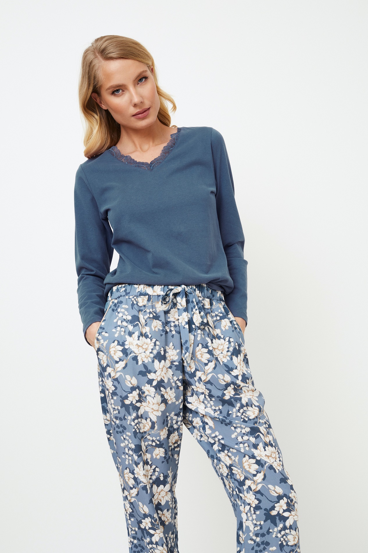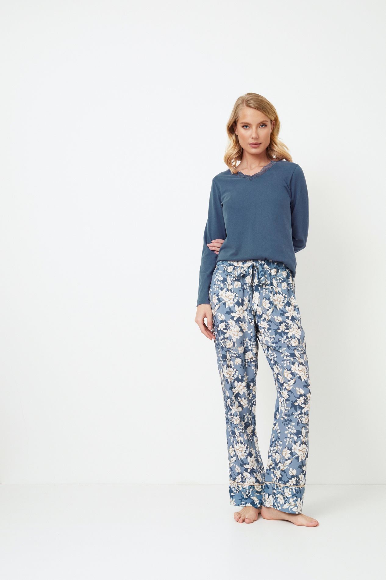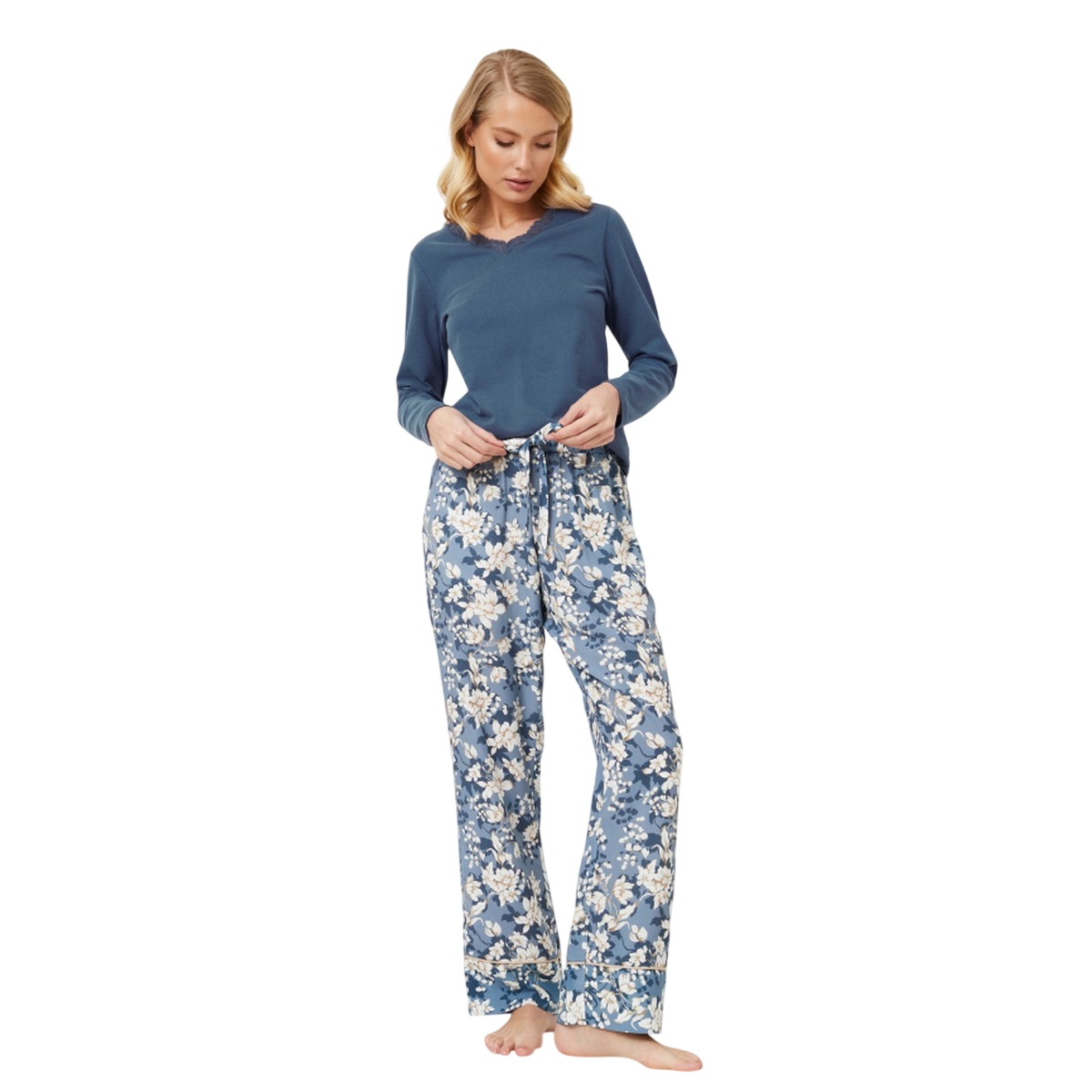 Aruelle – европейский бренд домашней одежды для людей, которые предпочитают комфорт, наслаждаясь теплотой и домашним уютом. При производстве своей продукции компания всегда руководствуется последними тенденциями моды и использует только лучшие ткани. Бренд Aruelle для тех, кто ценит качество и стиль. Комплект Fleur ваш восхитительный выбор для отдыха. Верх выполнен из трикотажной ткани из смеси хлопка и полиэстера однотонного синего цвета. Вырез украшен изящными кружевными вставками, придающими ему легкую элегантность. Брюки выполнены из легкой вискозы с очаровательным голубым цветочным рисунком. Брюки украшены кантами вдоль карманов и строчкой внизу. Этот пижамный комплект идеально подходит для уютных вечеров. Состав: верх: 60% хлопок, 40% полиэстер, низ: 100% вискоза.
