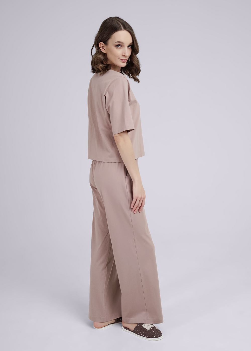 Мягкий и приятный комплект из хлопка создан специально для комфорта в повседневной жизни. Эта женская пижама включает просторную футболку и свободные брюки с эластичным поясом. Благодаря свободному крою, этот комплект не сковывает движений и позволяет чувствовать себя свободно и комфортно. Футболка прямого силуэта с втачным коротким рукавом, горловина округлая. Брюки прямые с поясом на резинке, карманы с отрезным боковым краем. Одежда из хлопка гипоаллергенная и экологичная, не вызывает раздражений на коже. Уход за изделием простой, можно подвергать машинной стирке, после нее вещи не сядут и не полиняют.