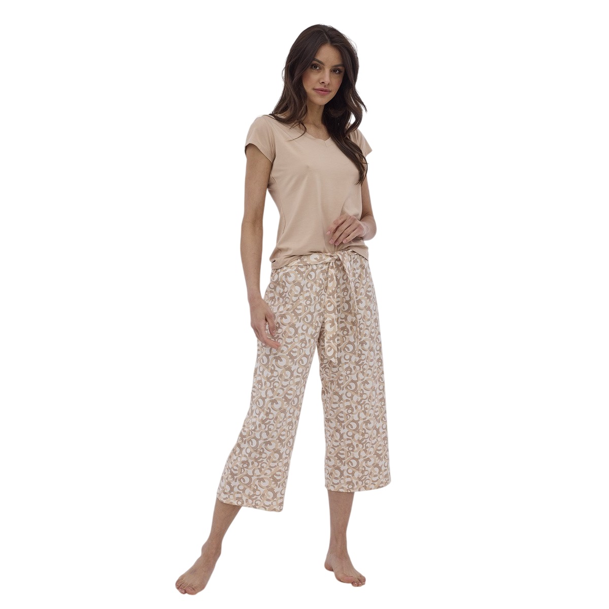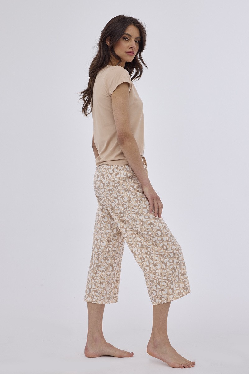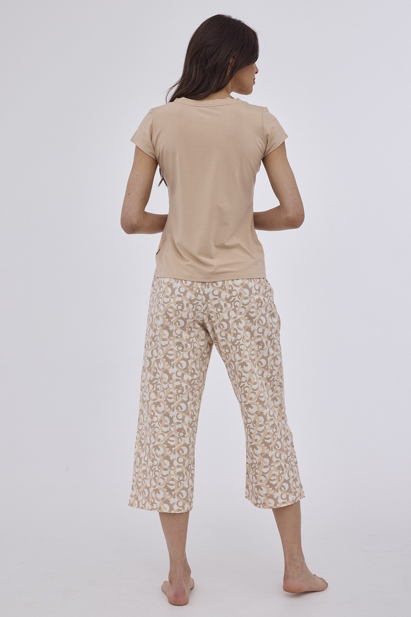 Женский комплект Suzana подарит комфорт. Модель с однотонной футболкой свободного кроя и спущеной линией плеча. И брюки-кюлоты в тон с контрастным узором. Состав: Футболка: 95% модал, 5% эластан. Кюлоты: 100% хлопок