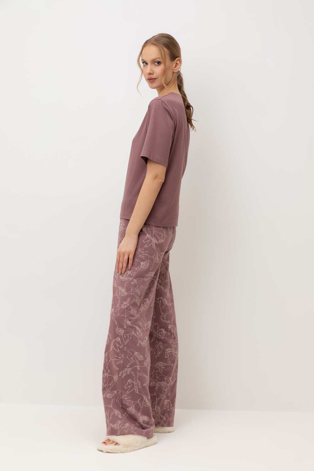 Дизайн пижамы включает нежный принт с изображением лошадей, который добавляет образу утончённости и стиля. Пижама состоит из футболки с коротким рукавом и свободных брюк. Футболка имеет удобный круглый вырез, а брюки оснащены эластичным поясом, обеспечивающим комфорт и свободу движений, а так же позволяет регулировать посадку.Эта пижама идеально подойдёт для домашнего отдыха или сна, создавая ощущение уюта и расслабления.