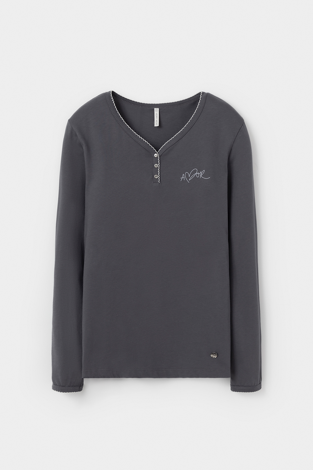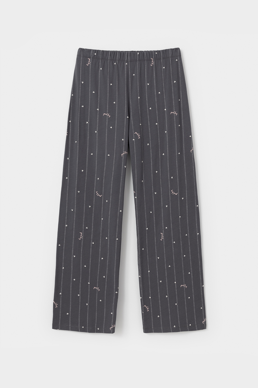 Пижама из 100% хлопка — это идеальный выбор для комфортного сна и отдыха. Комплект выполнен из мягкого и дышащего материала, который обеспечивает приятные тактильные ощущения и комфорт в течение всей ночи.Пижама состоит из лонгслива с длинными рукавами и брюк прямого кроя. Лонгслив имеет удобный V-образный вырез с декоративной планкой на пуговицах, что добавляет стильный акцент. Брюки оснащены эластичным поясом, обеспечивающим комфорт и свободу движений.Дизайн пижамы украшен тонкими вертикальными полосками и милыми сердечками, что придаёт образу нежность и уют. Серый цвет делает комплект универсальным и подходящим для любого времени года.Эта пижама станет отличным выбором для тех, кто ценит комфорт, стиль и качество.