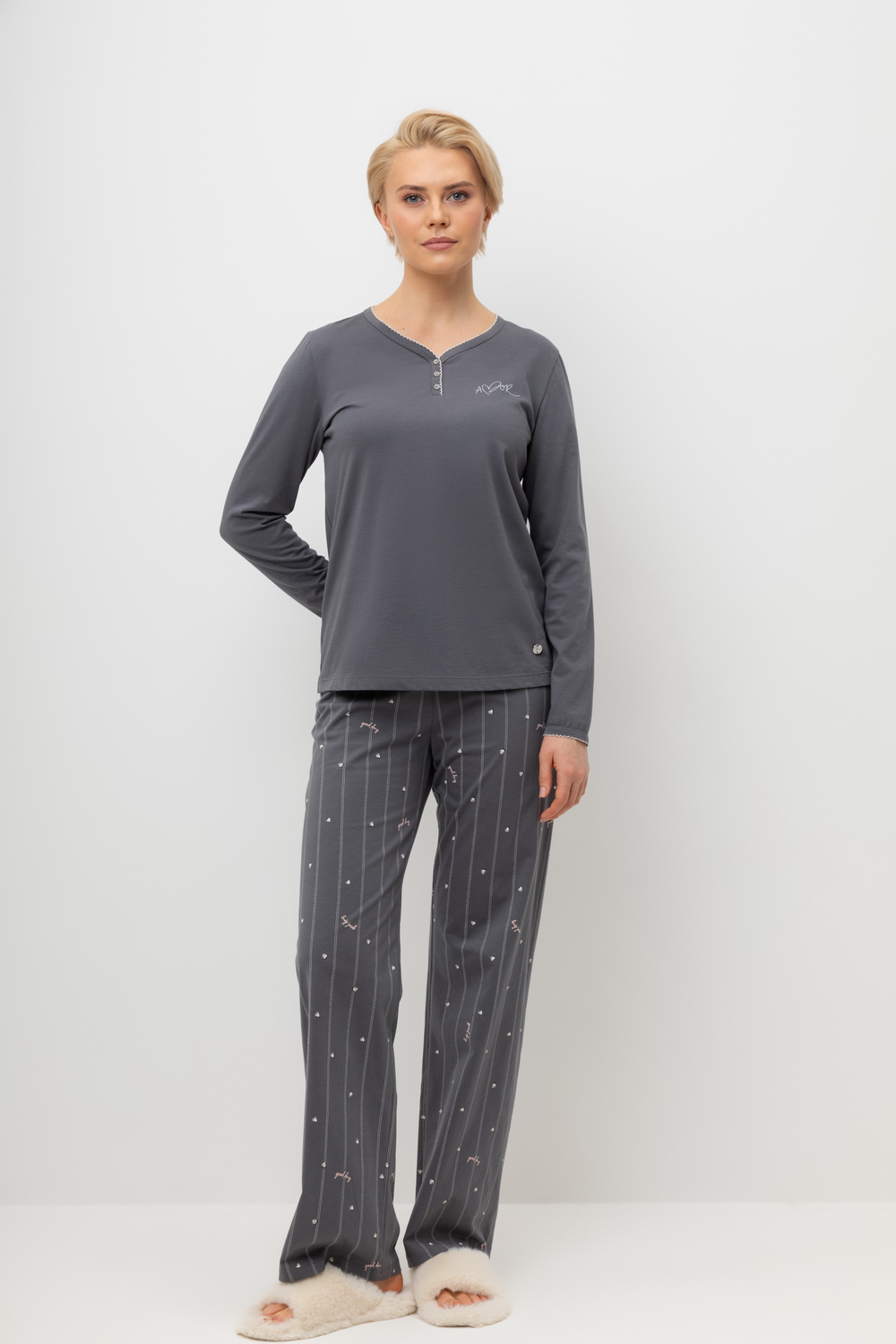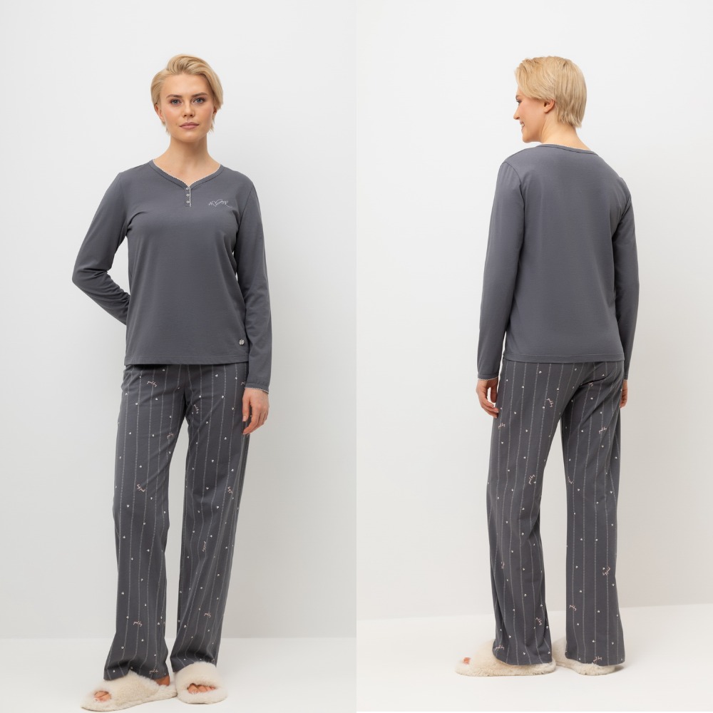 Пижама из 100% хлопка — это идеальный выбор для комфортного сна и отдыха. Комплект выполнен из мягкого и дышащего материала, который обеспечивает приятные тактильные ощущения и комфорт в течение всей ночи.Пижама состоит из лонгслива с длинными рукавами и брюк прямого кроя. Лонгслив имеет удобный V-образный вырез с декоративной планкой на пуговицах, что добавляет стильный акцент. Брюки оснащены эластичным поясом, обеспечивающим комфорт и свободу движений.Дизайн пижамы украшен тонкими вертикальными полосками и милыми сердечками, что придаёт образу нежность и уют. Серый цвет делает комплект универсальным и подходящим для любого времени года.Эта пижама станет отличным выбором для тех, кто ценит комфорт, стиль и качество.