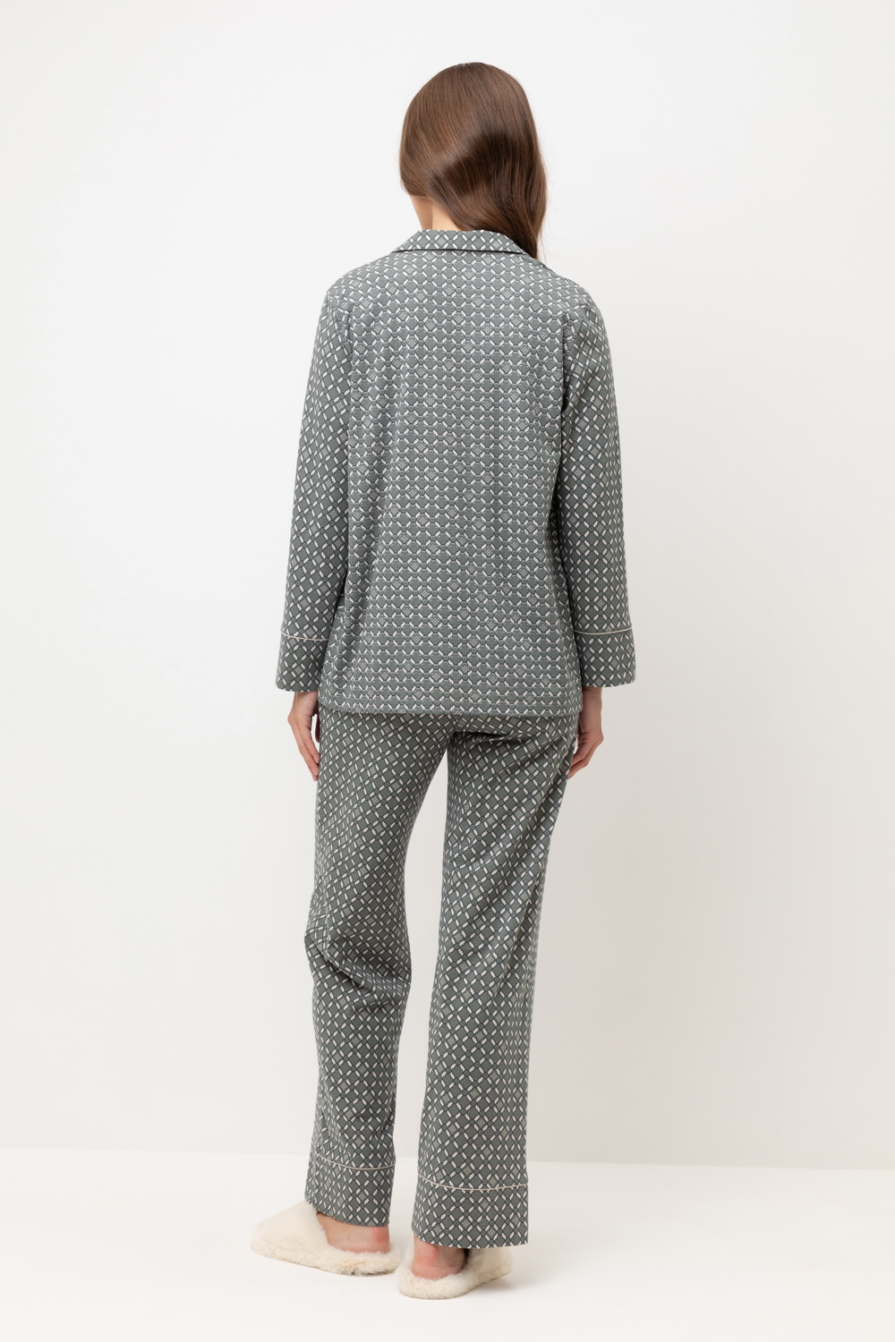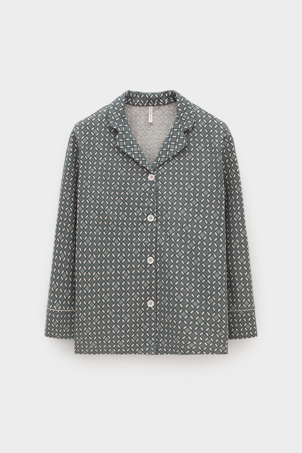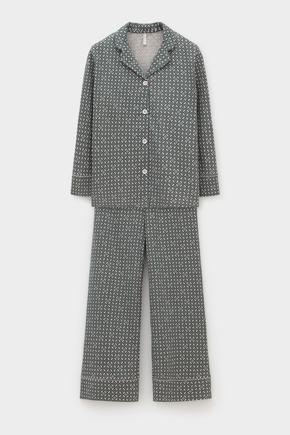 Женский хлопковый пижамный комплект из рубашки и брюк — это идеальный выбор для комфортного сна и отдыха. Комплект выполнен из 100% хлопка, что обеспечивает мягкость, воздухопроницаемость и приятные ощущения на коже. Рубашка с длинными рукавами и воротником на пуговицах имеет свободный крой, что позволяет чувствовать себя комфортно в течение всей ночи. Брюки прямого силуэта дополняют образ, создавая удобство и стиль. Универсальный цвет с геометрическим узором придаёт комплекту элегантность и многофункциональность, позволяя сочетать его с другими элементами домашнего гардероба. Этот комплект станет отличным подарком для себя или близких, обеспечивая уют и комфорт в любое время года.
