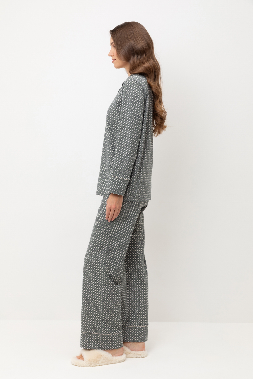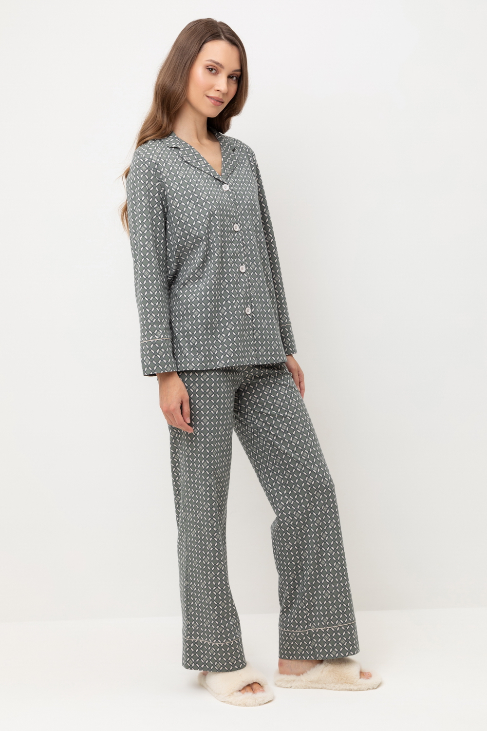 Женский хлопковый пижамный комплект из рубашки и брюк — это идеальный выбор для комфортного сна и отдыха. Комплект выполнен из 100% хлопка, что обеспечивает мягкость, воздухопроницаемость и приятные ощущения на коже. Рубашка с длинными рукавами и воротником на пуговицах имеет свободный крой, что позволяет чувствовать себя комфортно в течение всей ночи. Брюки прямого силуэта дополняют образ, создавая удобство и стиль. Универсальный цвет с геометрическим узором придаёт комплекту элегантность и многофункциональность, позволяя сочетать его с другими элементами домашнего гардероба. Этот комплект станет отличным подарком для себя или близких, обеспечивая уют и комфорт в любое время года.