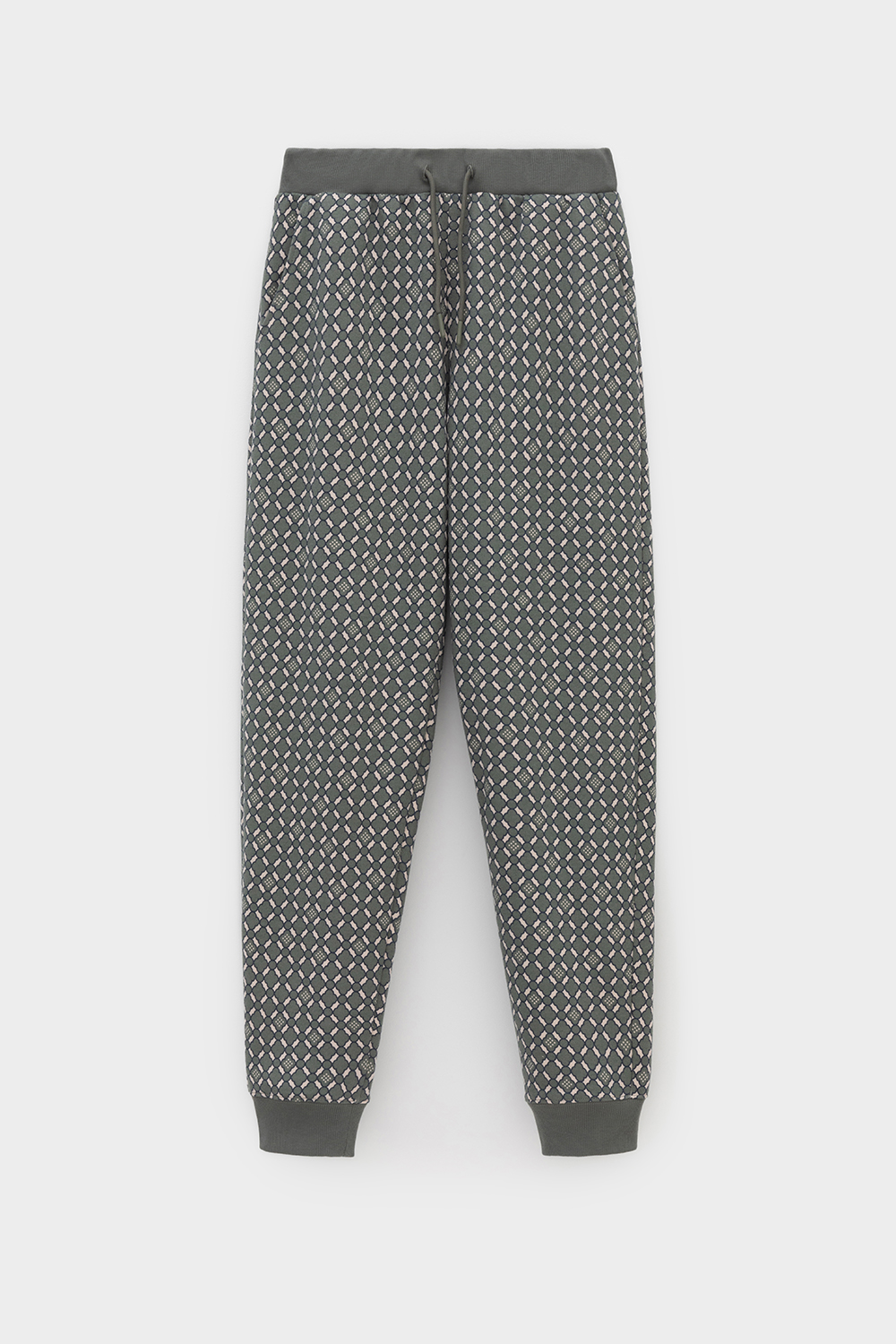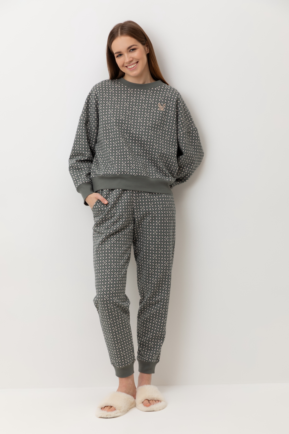 Пижама из 100% хлопка — это идеальный выбор для комфортного сна и отдыха. Комплект выполнен из мягкого и дышащего материала, который обеспечивает приятные тактильные ощущения и комфорт в течение всей ночи.Пижама состоит из толстовки с длинными рукавами и брюк прямого кроя. Толстовка имеет удобный круглый вырез, а брюки оснащены эластичным поясом, обеспечивающим комфорт и свободу движений.Дизайн пижамы украшен нежным геометрическим принтом, который придаёт образу стиль и уют. Серый цвет делает комплект универсальным и подходящим для любого времени года.Эта пижама станет отличным выбором для тех, кто ценит комфорт, стиль и качество.