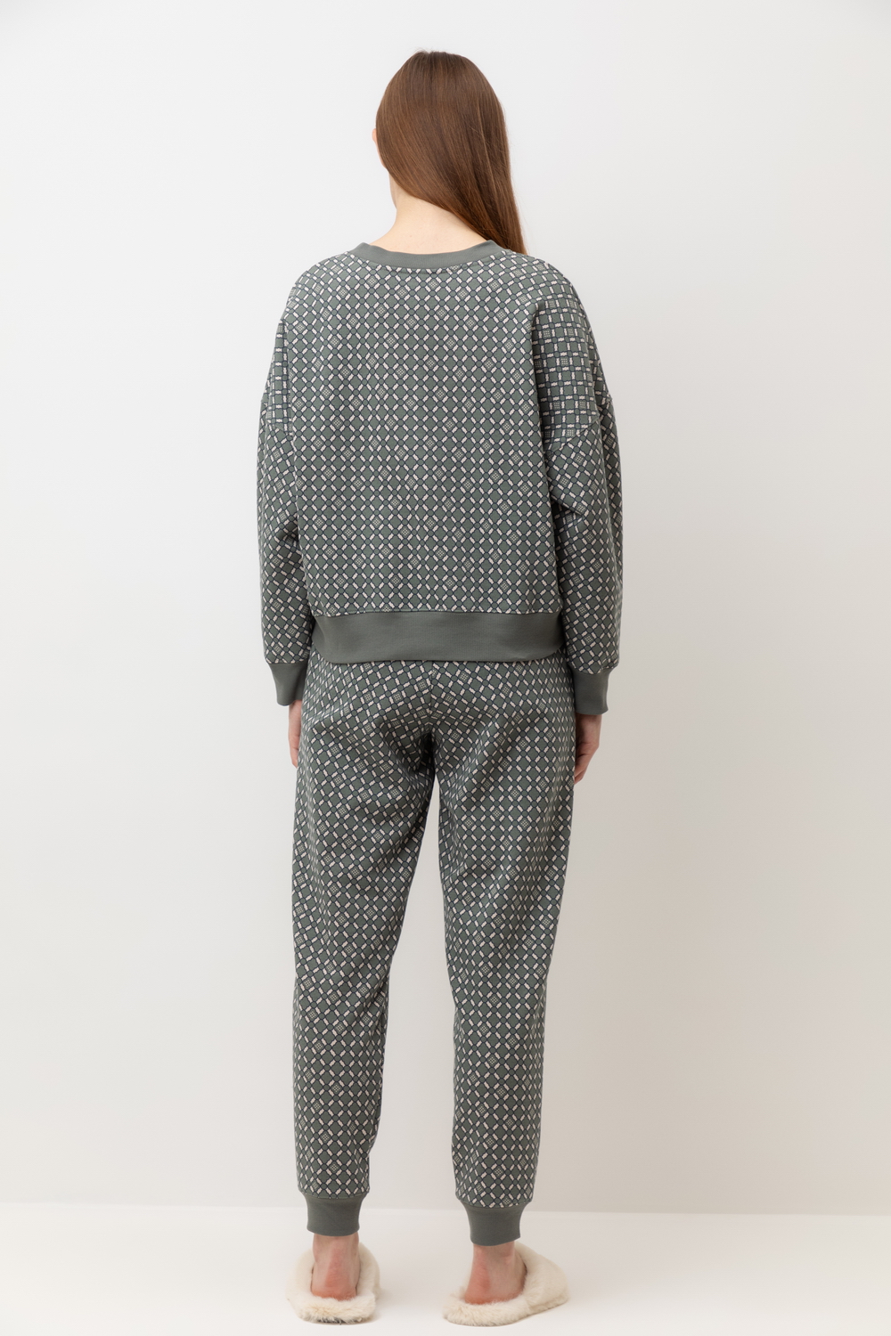 Пижама из 100% хлопка — это идеальный выбор для комфортного сна и отдыха. Комплект выполнен из мягкого и дышащего материала, который обеспечивает приятные тактильные ощущения и комфорт в течение всей ночи.Пижама состоит из толстовки с длинными рукавами и брюк прямого кроя. Толстовка имеет удобный круглый вырез, а брюки оснащены эластичным поясом, обеспечивающим комфорт и свободу движений.Дизайн пижамы украшен нежным геометрическим принтом, который придаёт образу стиль и уют. Серый цвет делает комплект универсальным и подходящим для любого времени года.Эта пижама станет отличным выбором для тех, кто ценит комфорт, стиль и качество.