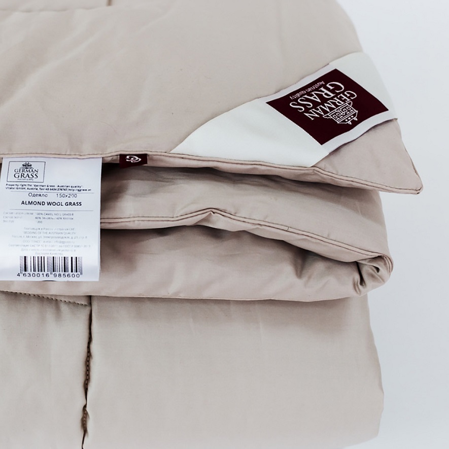 Теплое стеганое одеяло Almond Camel Grass наполнено 100% верблюжьим пухом, вычесанным вручную в чехле из хлопка и эвкалиптовых волокон.