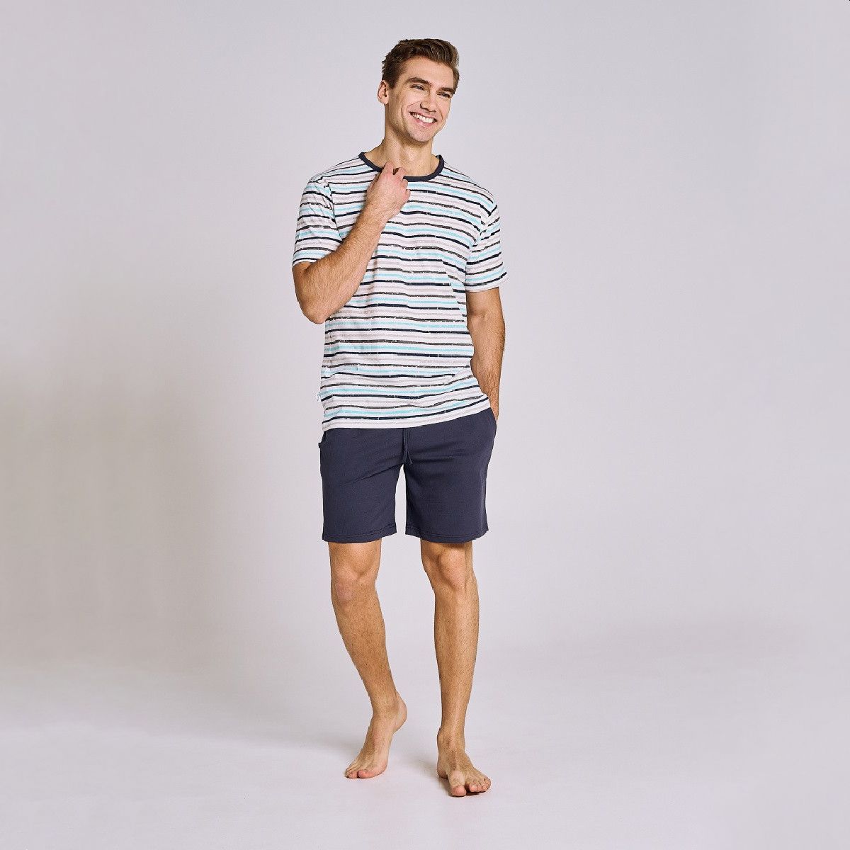Классическая мужская пижама. 100% натуральное волокно обеспечивает комфорт использования и долговечность. Футболка с круглым вырезом и лаконичным принтом на груди. Шорты в поясе на резинке и со шнурком, по бокам карманы.