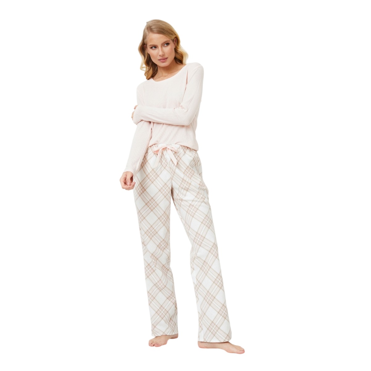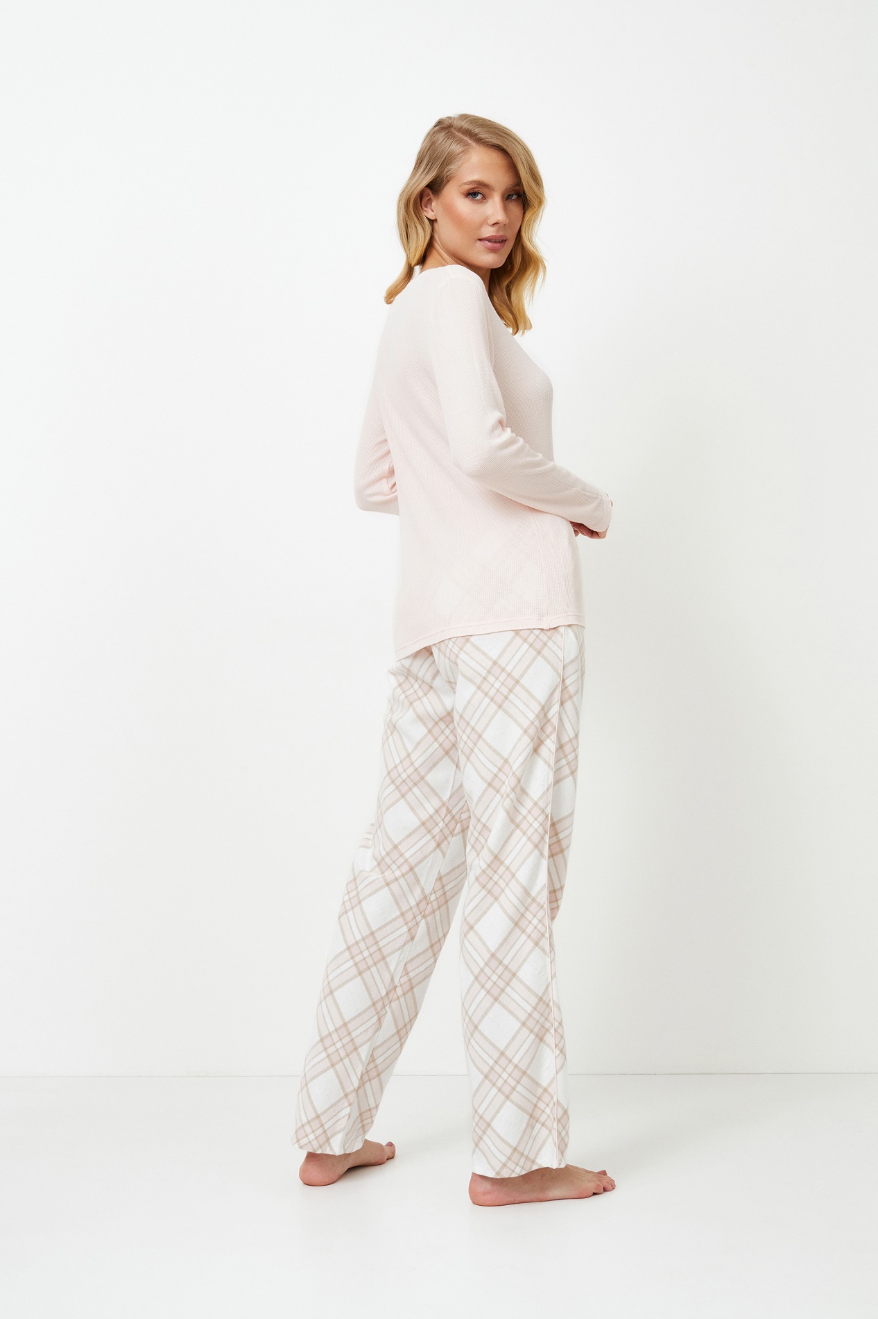 Комплект Claudia выполнен в мягких нейтральных оттенках. Футболка с длинными рукавами выполнена из мягкой вискозы пастельно-розового цвета, круглый вырез и небольшая вышивка в виде короны на груди. Брюки из матового хлопка в белую, бежевую и розовую клетку. Они классического кроя, завязываются на талии розовым бантом и украшены элегантной окантовкой по бокам. Футболка: 62% вискоза, 34% полиэстер 4% эластан Брюки: 100% хлопковый фланель.