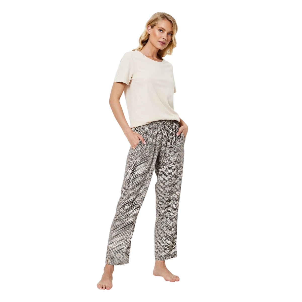 Уютный комплект Jade это идеальный баланс между комфортом и изысканным шиком. Футболка из мягкого хлопка с короткими рукавами выполнена в спокойном песочном оттенке и имеет классический круглый вырез, придающий образу непринужденную простоту. Она дополнена брюками повседневного покроя, завязывающимися на талии, с разрезами по низу брюк для создания утонченного стиля. Футболка: 100% хлопок Штаны: 100% вискоза