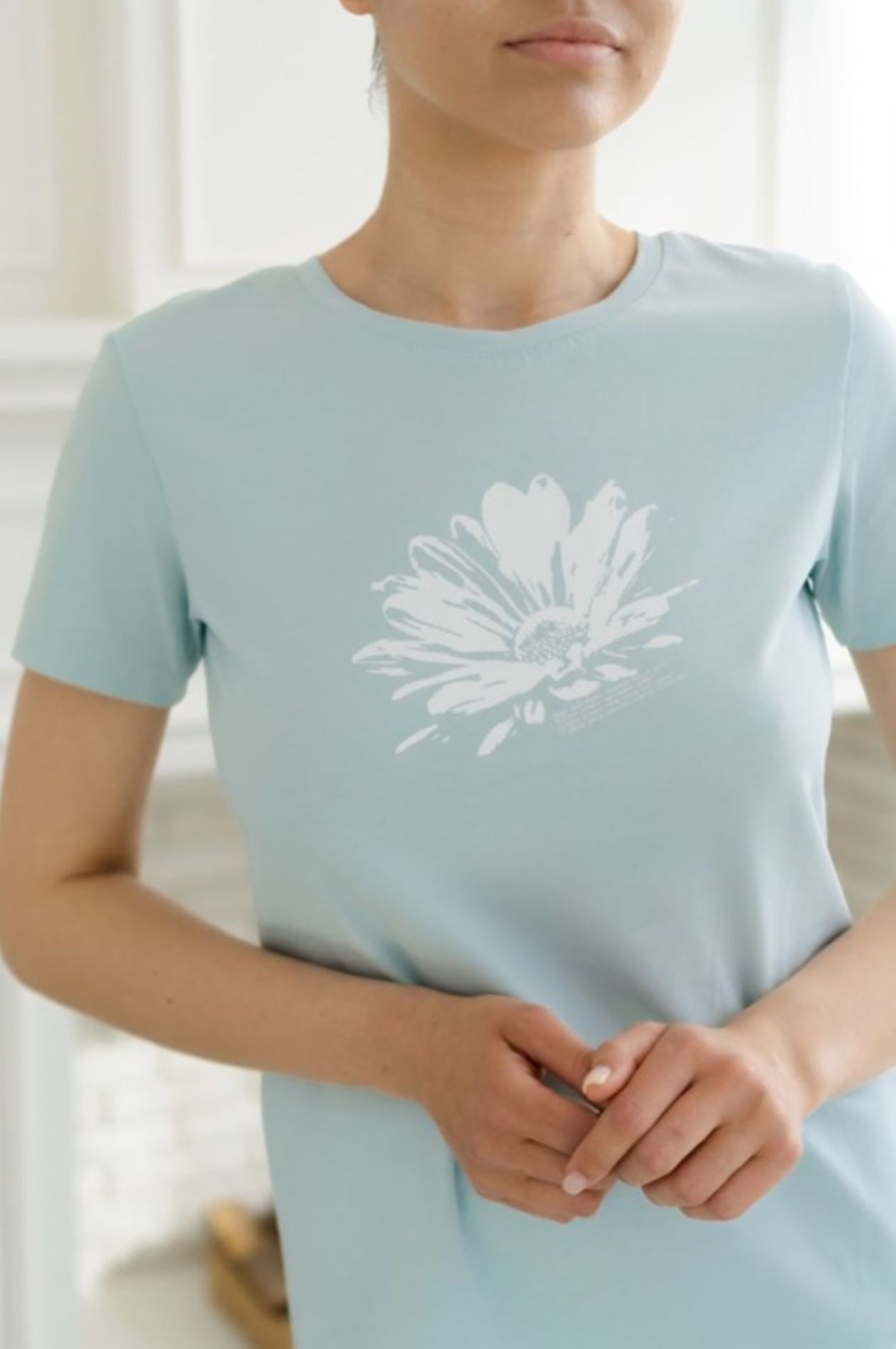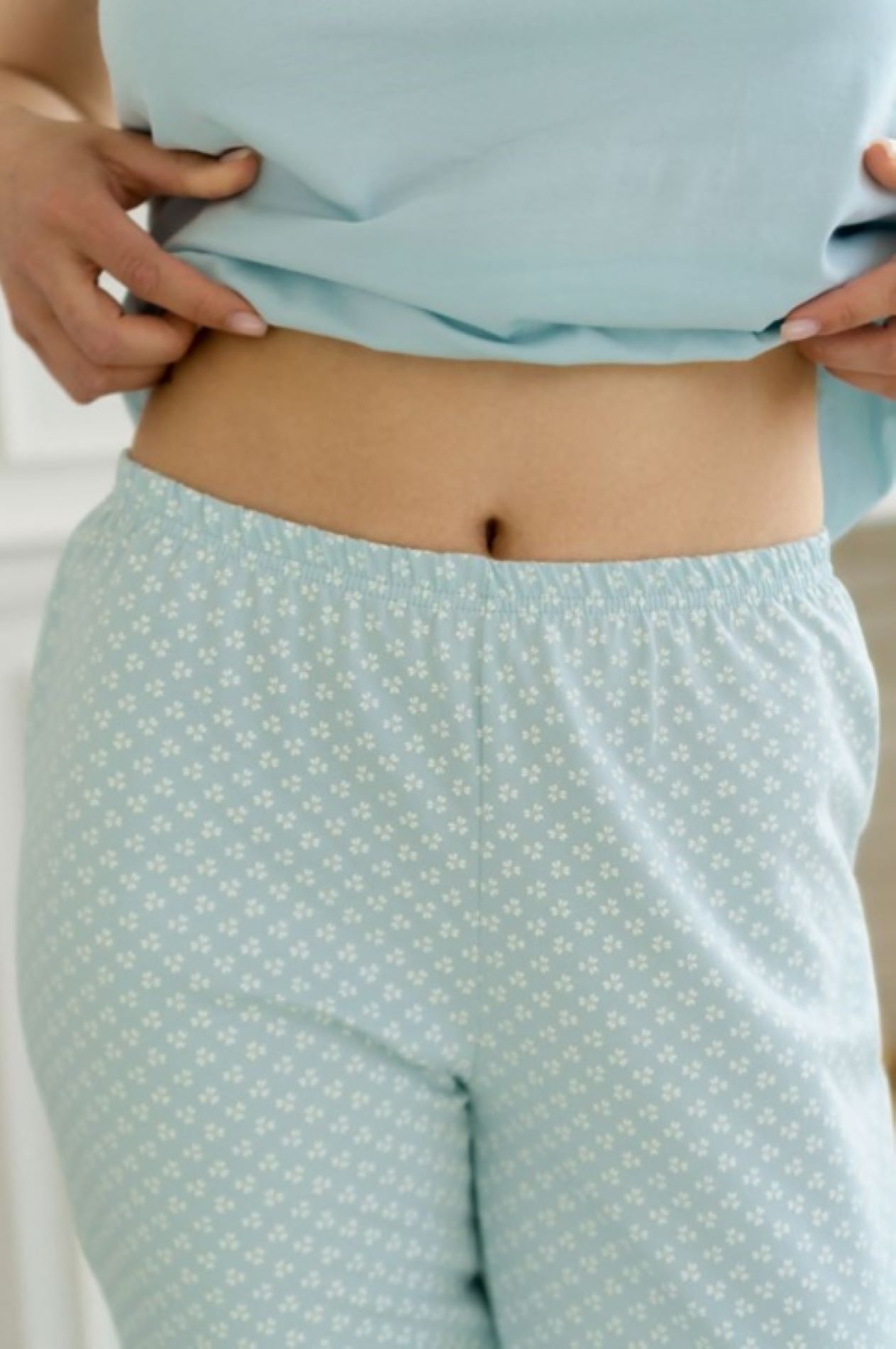 Пижама из хлопка состоит из футболки с коротким рукавом прямого силуэта и брюк свободного силуэта, прямые к низу, в боковых швах функциональные карманы.