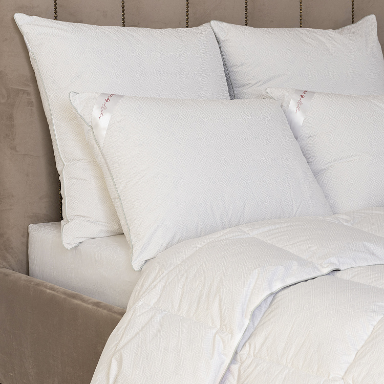 Чехол из хлопкового тика мягкий и приятный на ощупь. Ткань износостойкая, практичная, надежно держит объемный наполнитель. Подушку также можно использовать для комфортной поддержки спины при чтении книг в кровати. Наполнитель: 70% пух гусиный белый, 30% перо.
