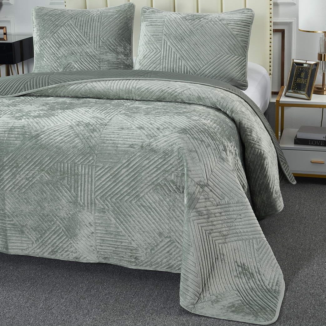 Серия стеганых велюровых покрывал от Sofi de Marko (Coфи де Марко). Покрывало украшает лаконичный геометрический орнамент. Геометрия всегда была и остаётся актуальной классикой. Конфигурация различных фигур, углов и линий позволяет им органично вписаться в самые разнообразные интерьерные стили. Покрывало состоит на 30% из хлопка и на 70% из вискозы. Вся продукция текстильного производителя Sofi De Marko выполнена из экологически чистых материалов и красителей, гипоаллергенна, не вызывает раздражения кожи, не теряет своего презентабельного вида и мягкости после стирки. В комплект входят покрывало и две наволочки из аналогичного материала. Каждый комплект заботливо упакован в стильную фирменную сумку.