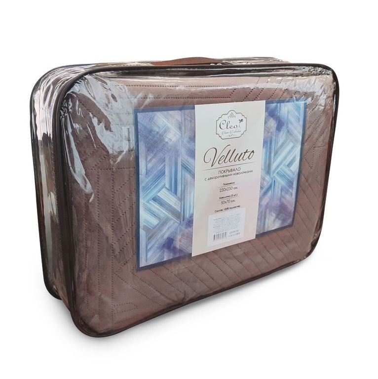 Покрывало коллекции Velutto отличается удивительно мягкой поверхностью и при этом сохраняет износостойкость и прочность. Эта коллекция покрывал состоит из приглушенных, пастельных расцветок, поверхность материала бархатистая, не блестит, по краям выполнена отделка тонким кантом (косая бейка). Повторяющийся узор образован стежкой, наполнитель – синтепон. Покрывало изготовлено из полиэстера. В комплект входят две наволочки с французским кантом. Изделие может стать украшением интерьера вашего дома, а также роскошным подарком для Ваших близких.
