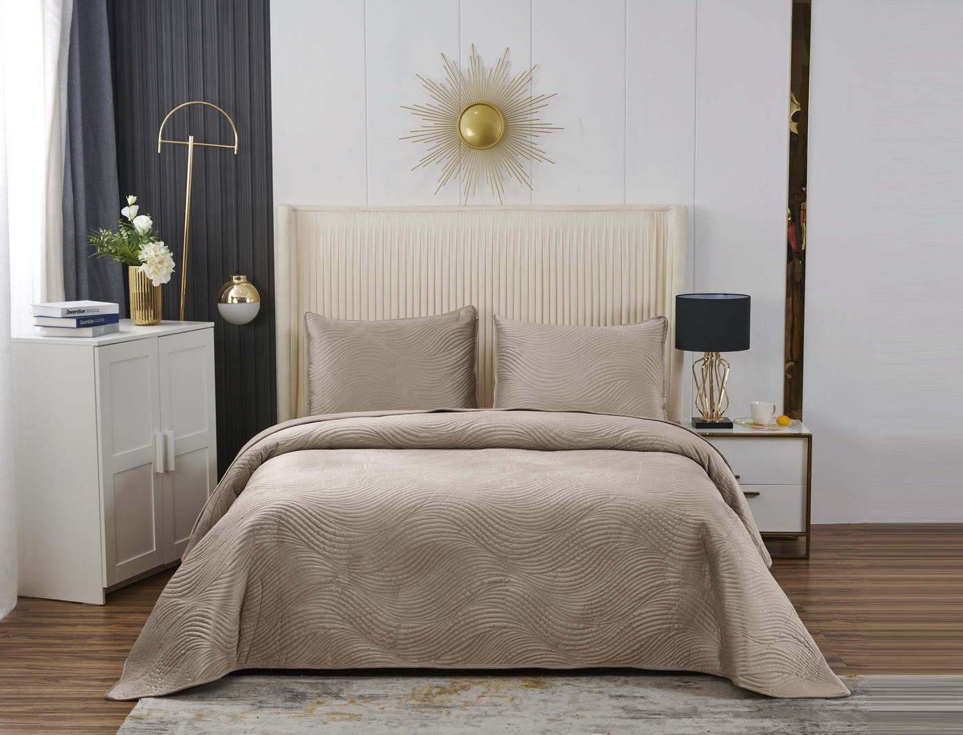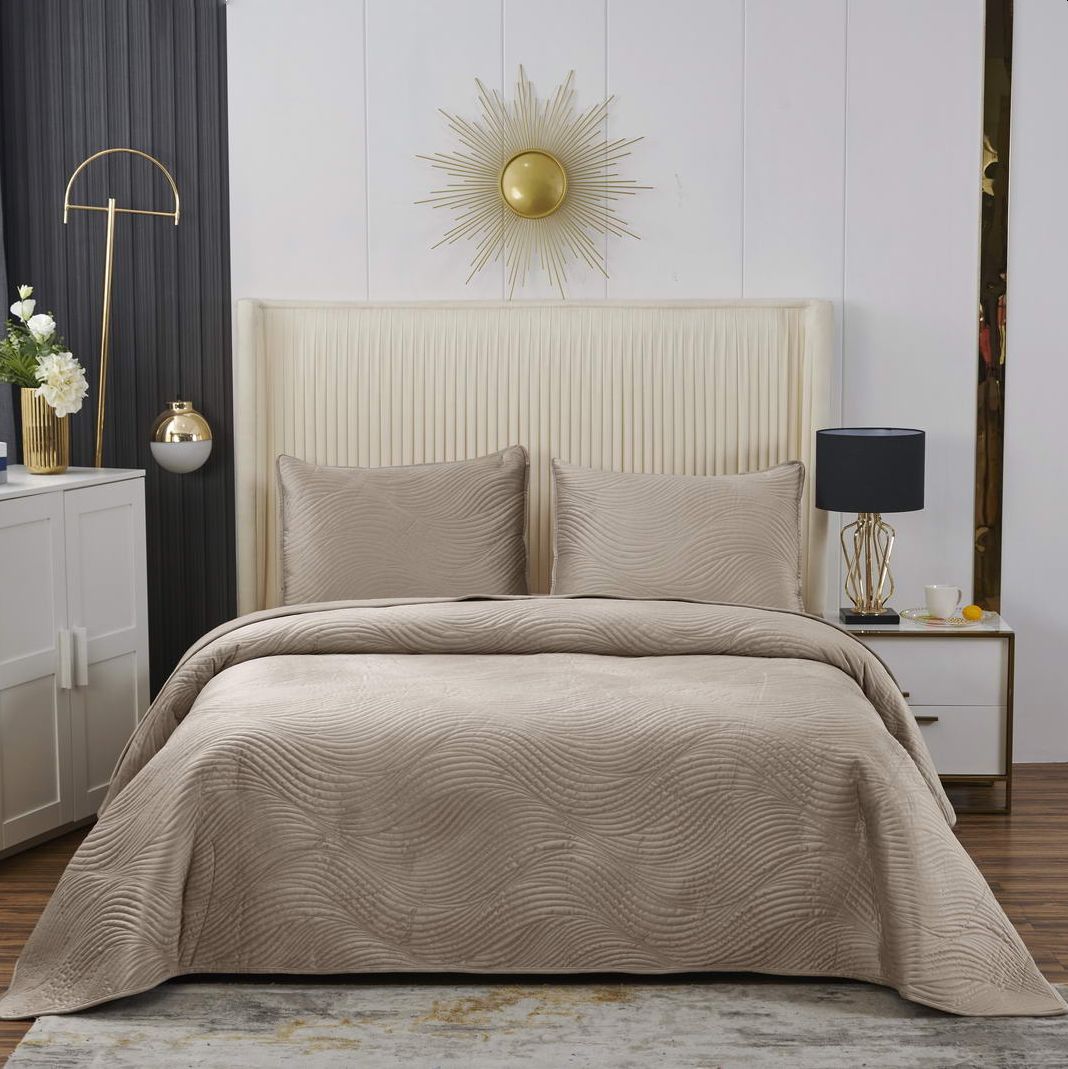 Велюровое покрывало Жизель с рисунком в виде плавных линий напоминает размеренные потоки воды, что оказывает на психику благоприятный эффект, помогает обрести умиротворение и привести мысли в порядок. Помимо положительного воздействия на нервную систему, рисунок в виде волны придаст изысканности и утонченности интерьеру.