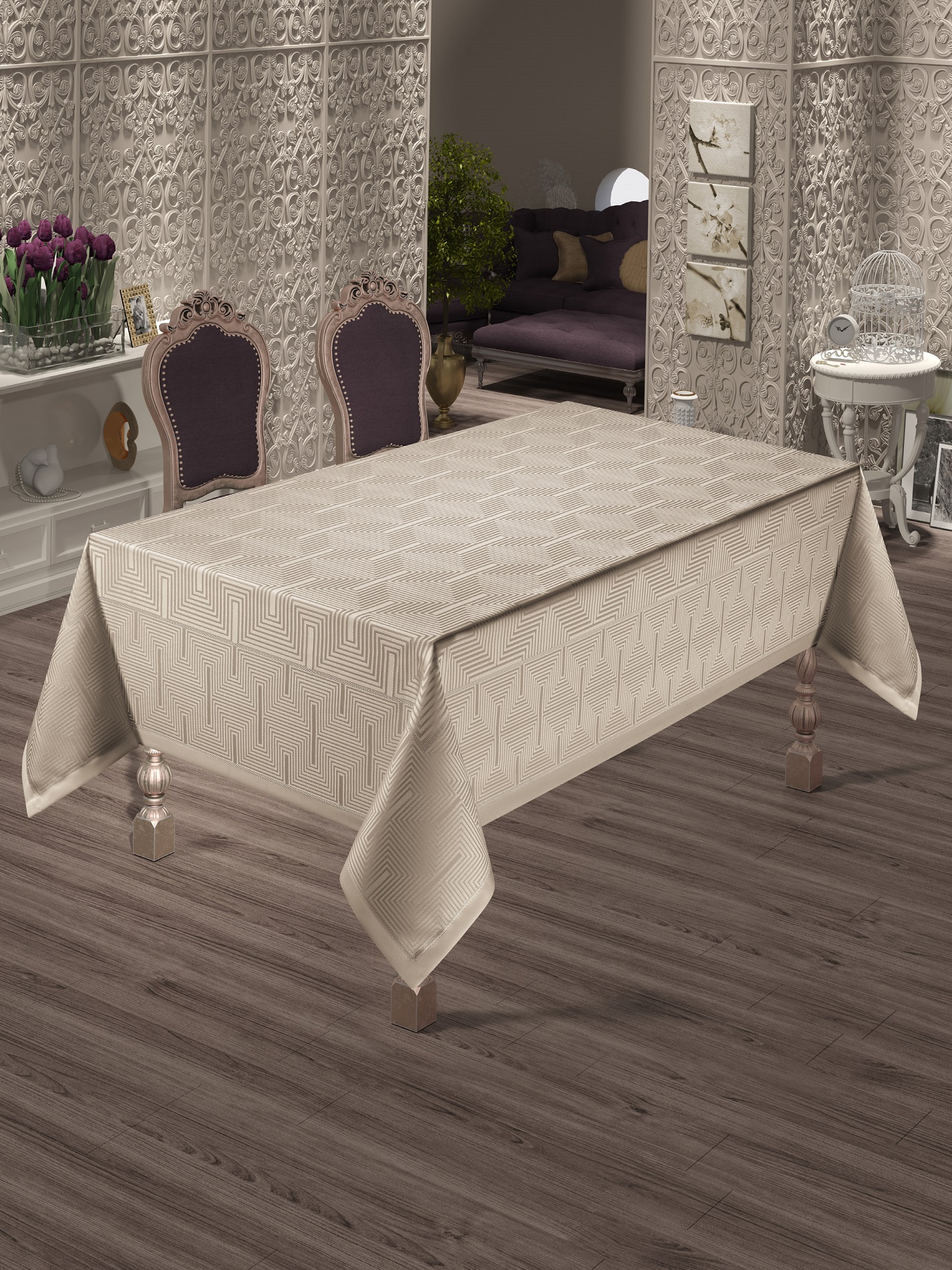 Жаккардовая скатерть из линейки Yildiz от турецкого бренда DO&CO.Ткань украшена изящным жаккардовым рисунком, символизирующего строгость и романтизм. Нити полиэстера, использующиеся в производстве, обеспечивают легкость ухода, сохраняют первоначальную форму. Она не растягивается, не садится и не мнётся, легко стирается и неприхотлива в уходе. Скатерть упакована в подарочную картонную коробку.