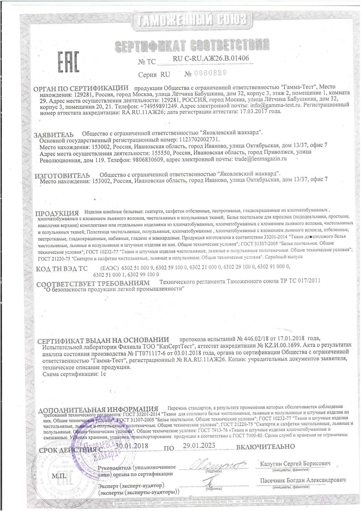 Скатерти Яковлевский жаккард станут украшением праздничного стола, а также отлично подойдут для ежедневного использования. Уникальные свойства льняной ткани позволяют с легкостью отстирывать любые пятна, а благодаря своей износостойкости, даже после очень большого количества стирок скатерть будет выглядеть как новая. Столовый текстиль обладает приглушенным матовым блеском, так как изготовлен из натурального волокна на основе льна и хлопка и будет отлично дополнять фарфоровую посуду и хрусталь. Лён — это экологический, чистый и безопасный материал обладающий гипоаллергенными свойствами, который с легкостью выдержит множество стирок и со временем будет только мягче и приятнее на ощупь. Льняные изделия не линяют и не выцветают сохраняя превосходный внешний вид.